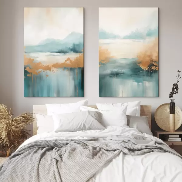 Quadri Paesaggio astratto con montagne e lago in verde acqua e giallo materico, pennellate morbide, opera d'arte minimalista Nr m01012