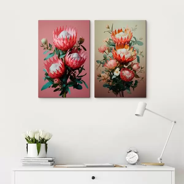 Quadri Proteas in due atmosfere: sfondo rosa intenso e una calda sfumatura oliva Nr m01092