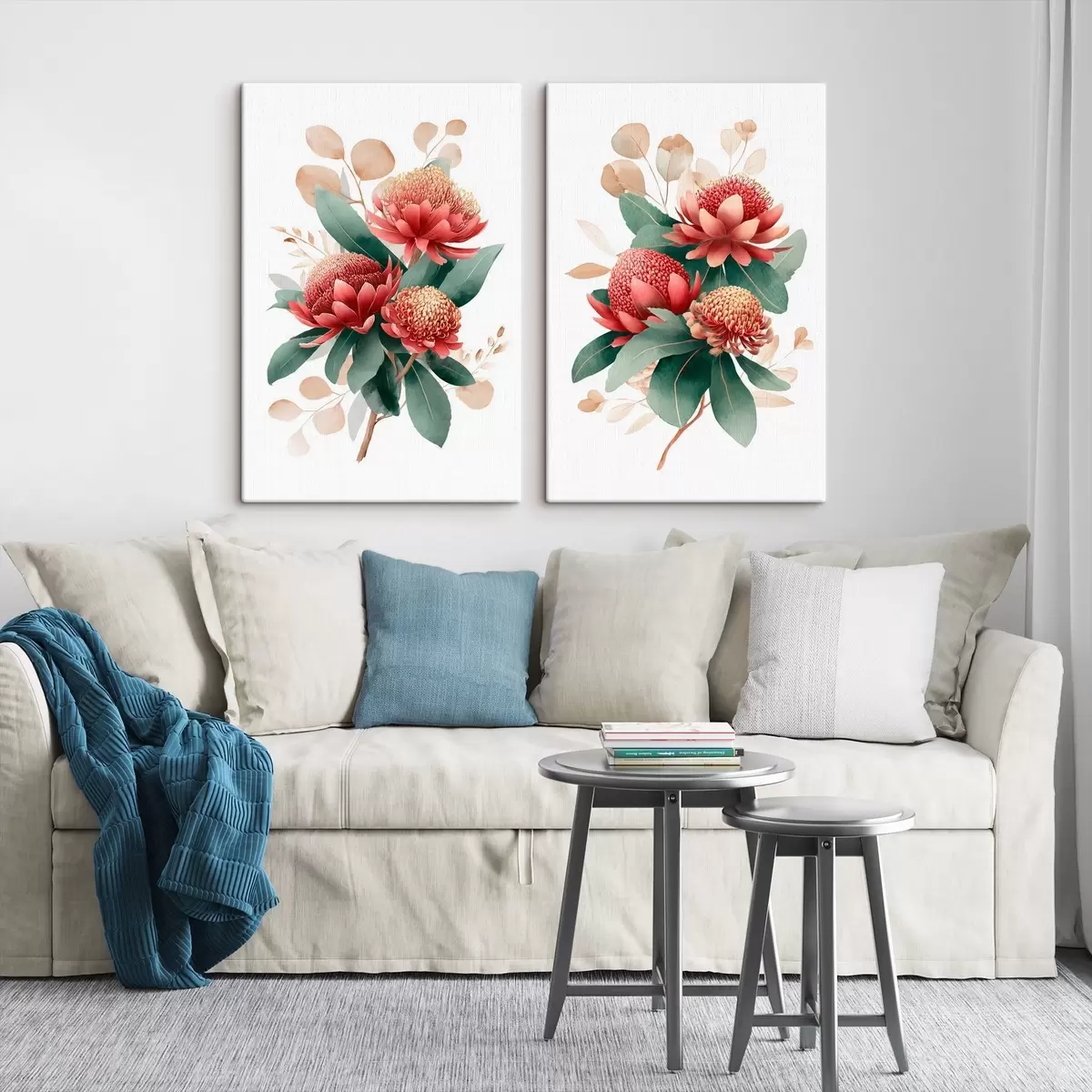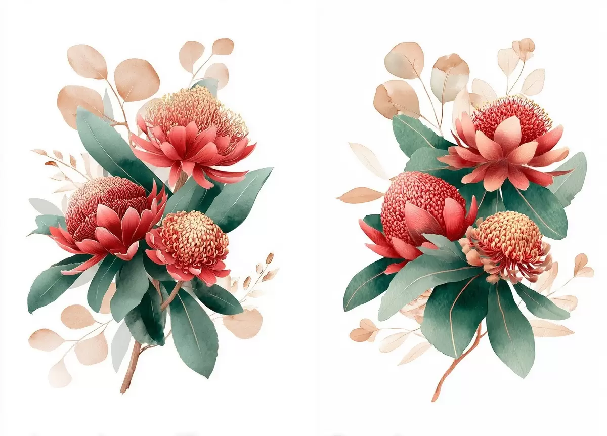 Quadri Composizione floreale con protee in una palette rosso corallo su sfondo bianco Nr m01096
