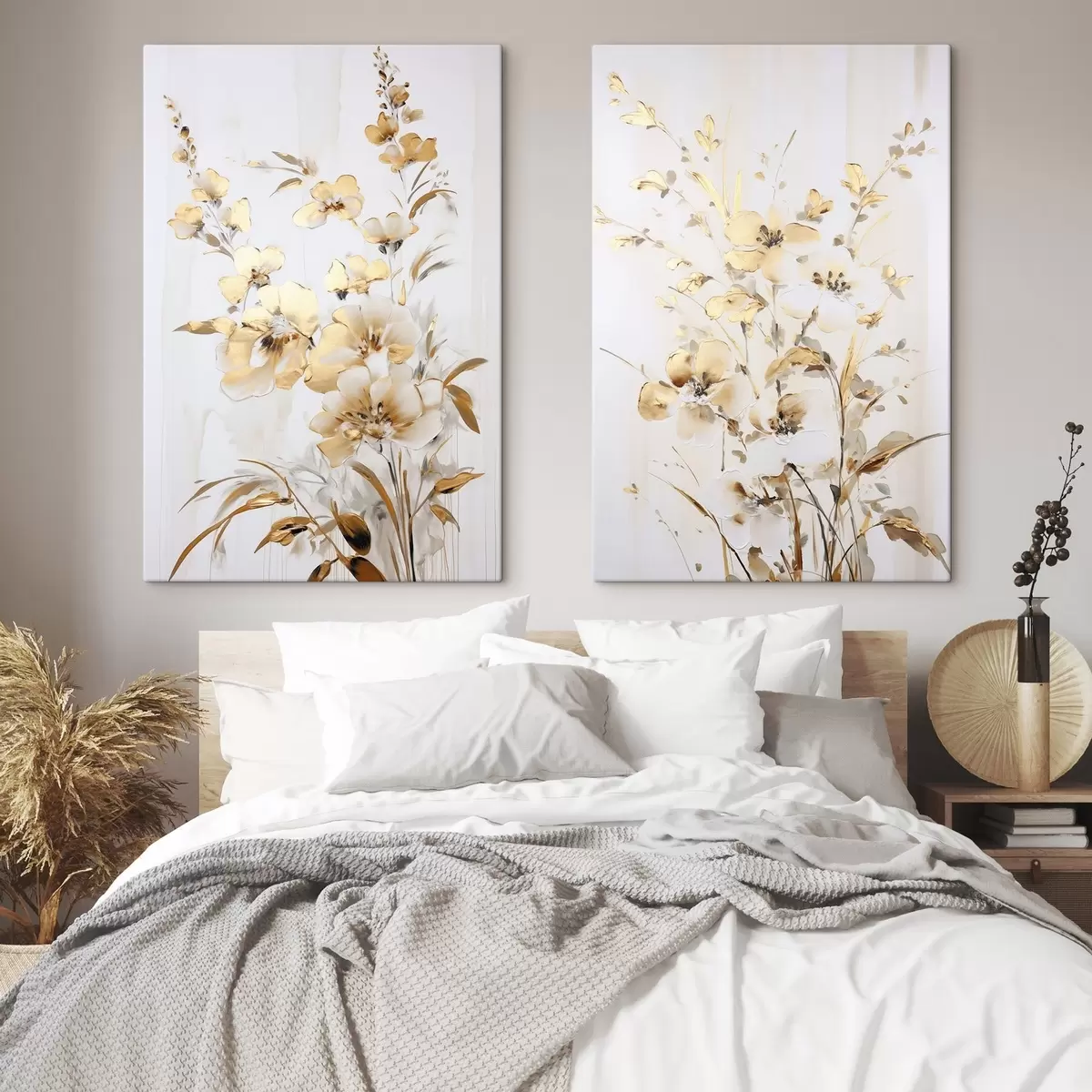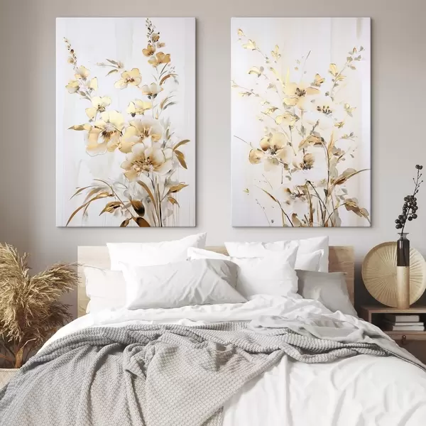Quadri Fiori e foglie gialli testurizzati su sfondo bianco, con delicate pennellate Nr m01116