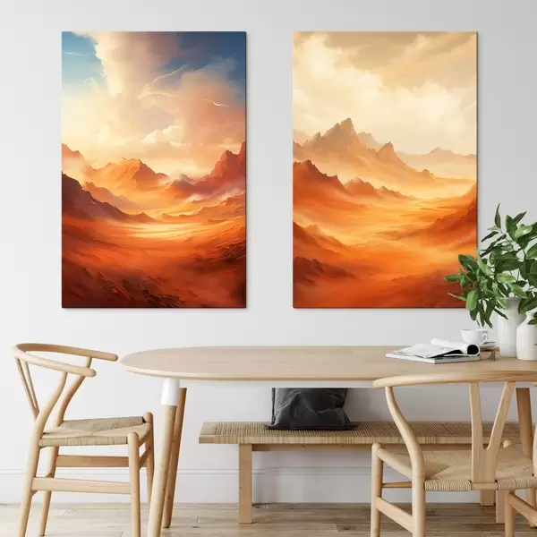 Quadri Un vasto paesaggio desertico arancione con imponenti montagne rocciose sotto un cielo nebbioso e soleggiato con nuvole sottili. Nr m01122