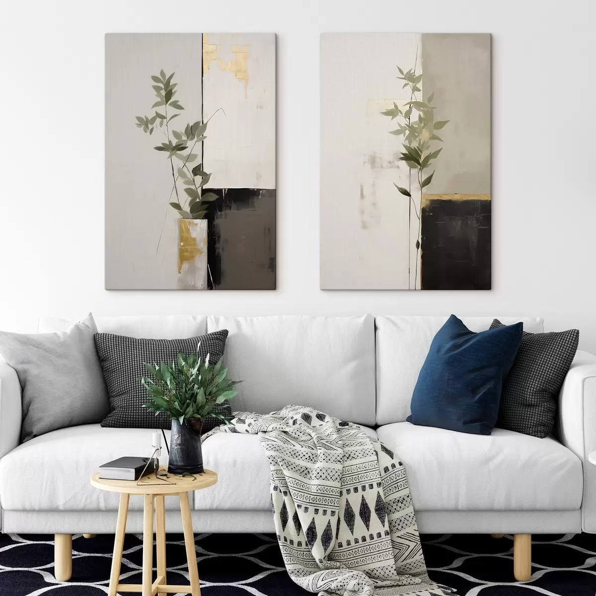 Quadri Un dipinto minimalista e materico raffigurante un vaso con foglie verdi su uno sfondo di forme geometriche astratte. Nr m01126