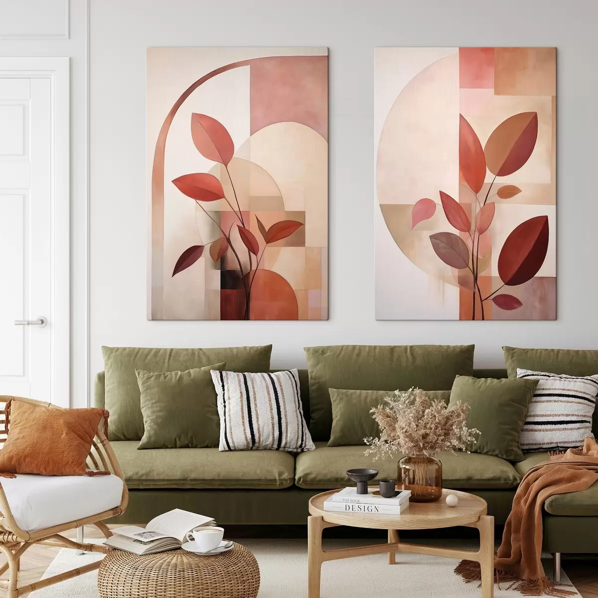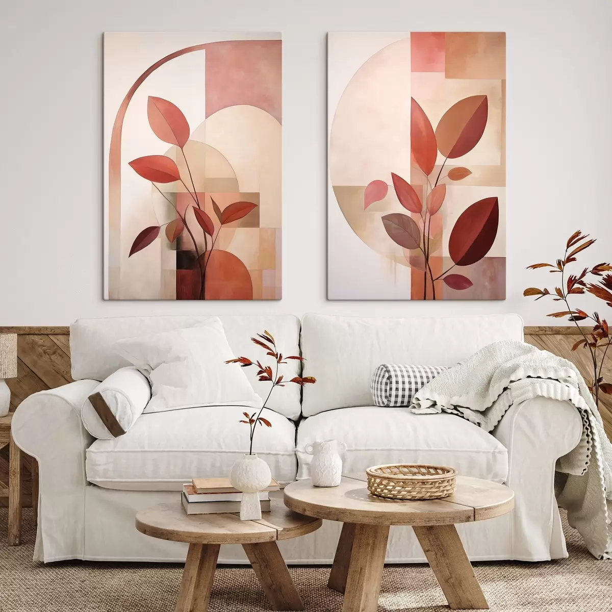 Quadri Pianta astratta con foglie rosse su uno sfondo di forme geometriche e colori tenui e delicati Nr m01128