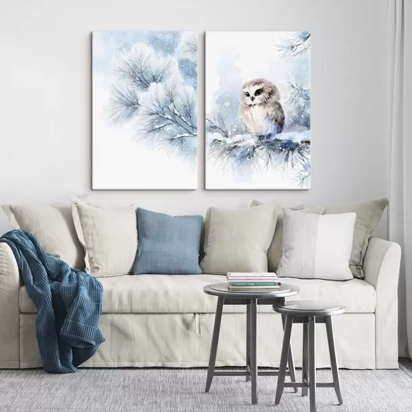 Quadri simpatico gufo su un ramo di pino innevato in stile acquerello Nr m01168