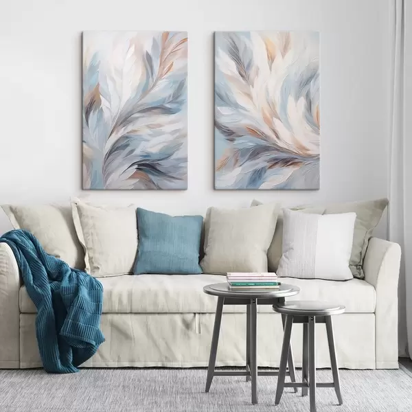 Quadri Dipinto astratto di piume nei toni del bianco, blu e marrone, con una texture morbida e fluida e uno sfondo chiaro. Nr m01234