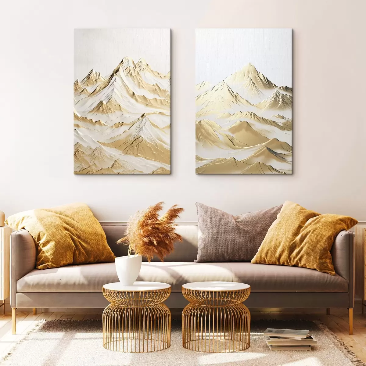 Quadri Un paesaggio di montagne innevate di colore giallo con cime aguzze e valli profonde sotto un cielo luminoso Nr m01236