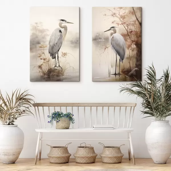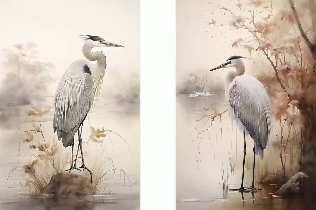 Quadri Un airone è in piedi su una roccia in un lago con erba alta e alberi sullo sfondo. Nr m01239