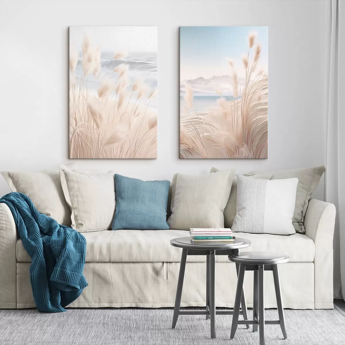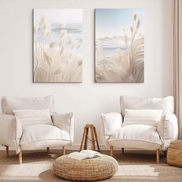 Quadri Alta erba della pampa piumosa nei toni del beige chiaro in primo piano, con una spiaggia sabbiosa sullo sfondo Nr m01242