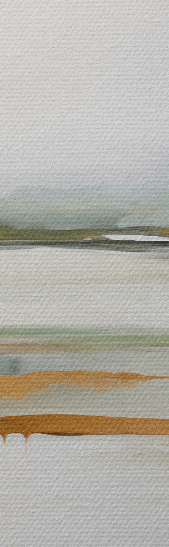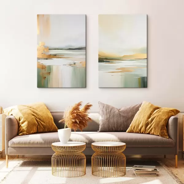 Quadri Paesaggio astratto con tonalità gialle e verdi, acqua che riflette il cielo e le montagne lontane, cielo pallido e nebbioso Nr m01245