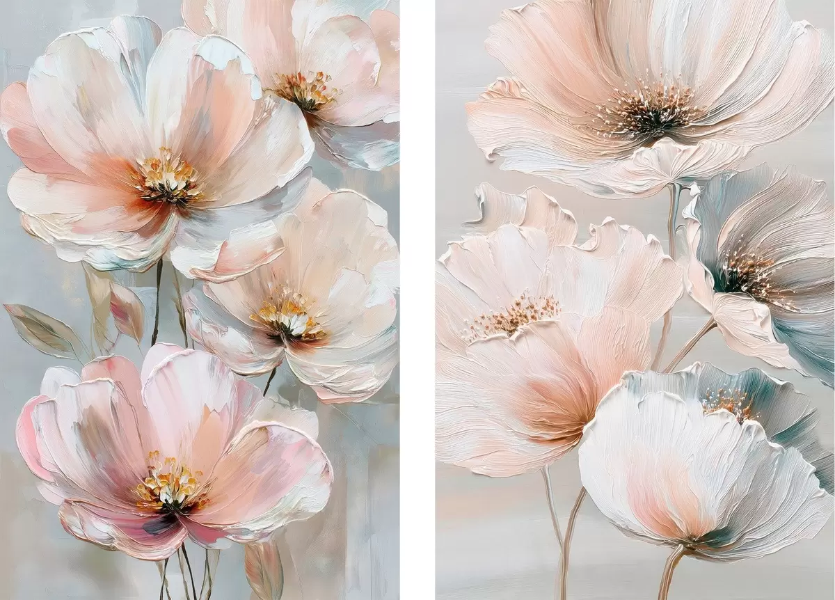 Quadri Dittico floreale in una palette di colori beige-corallo in stile pittura a olio Nr m30029