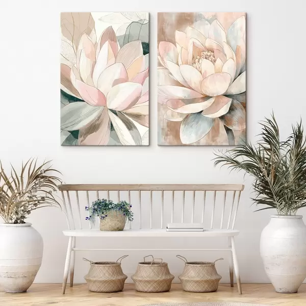 Quadri Composizione floreale con grandi fiori di loto in una palette di colori pastello-corallo Nr m30034