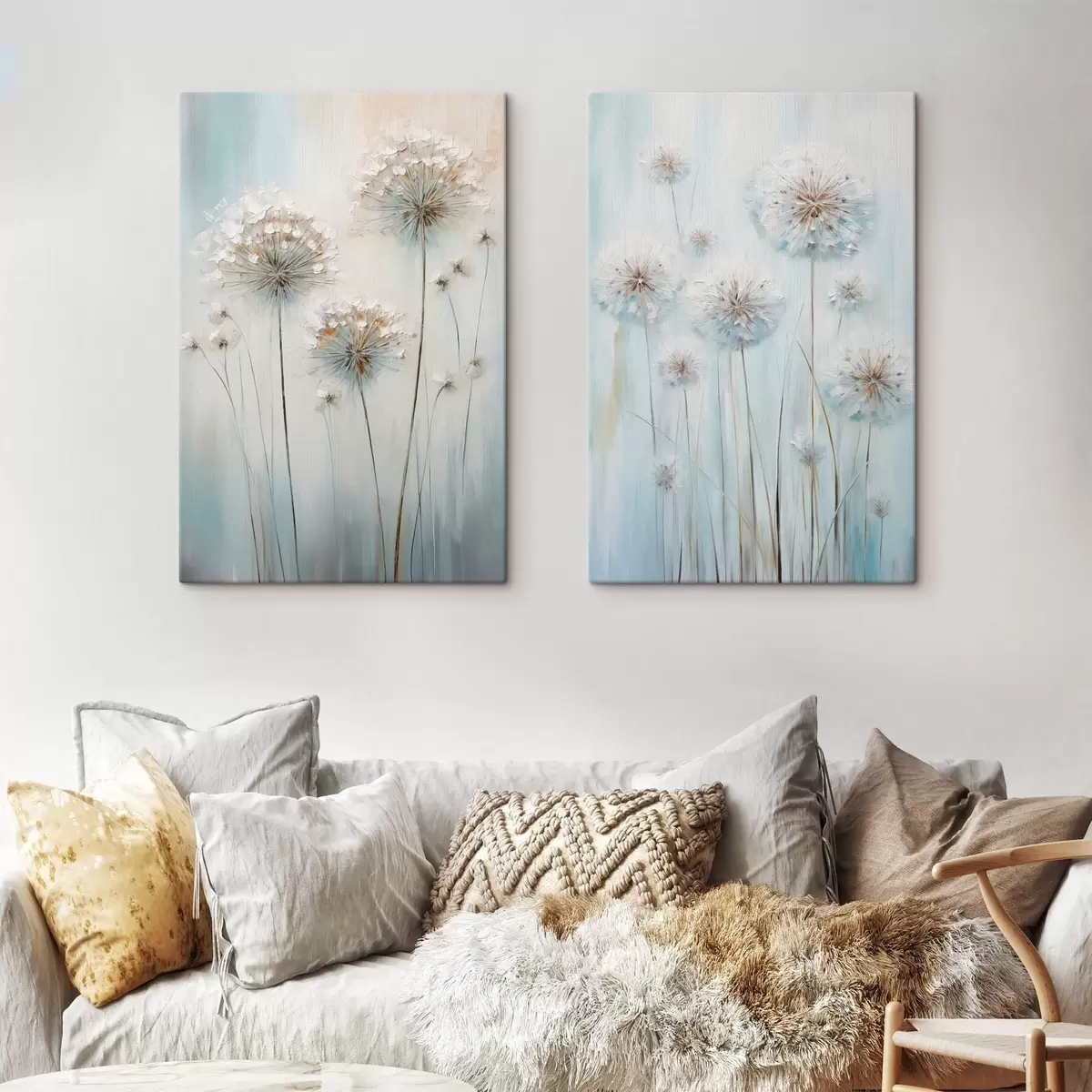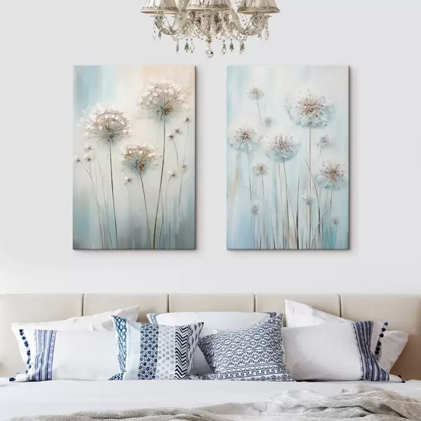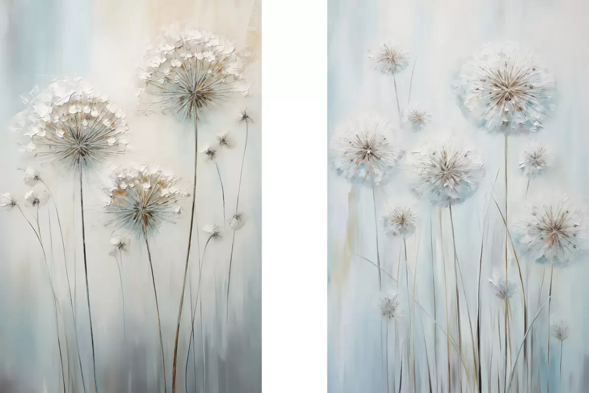 Quadri Stile pittorico materico di denti di leone su uno sfondo morbido blu e bianco Nr m30048