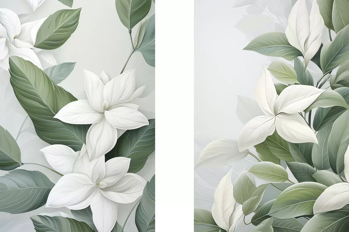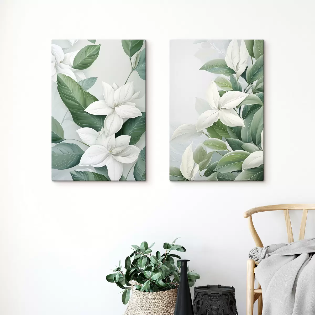 Quadri Fiori bianchi con foglie verdi, sfondo pastello Nr m30055