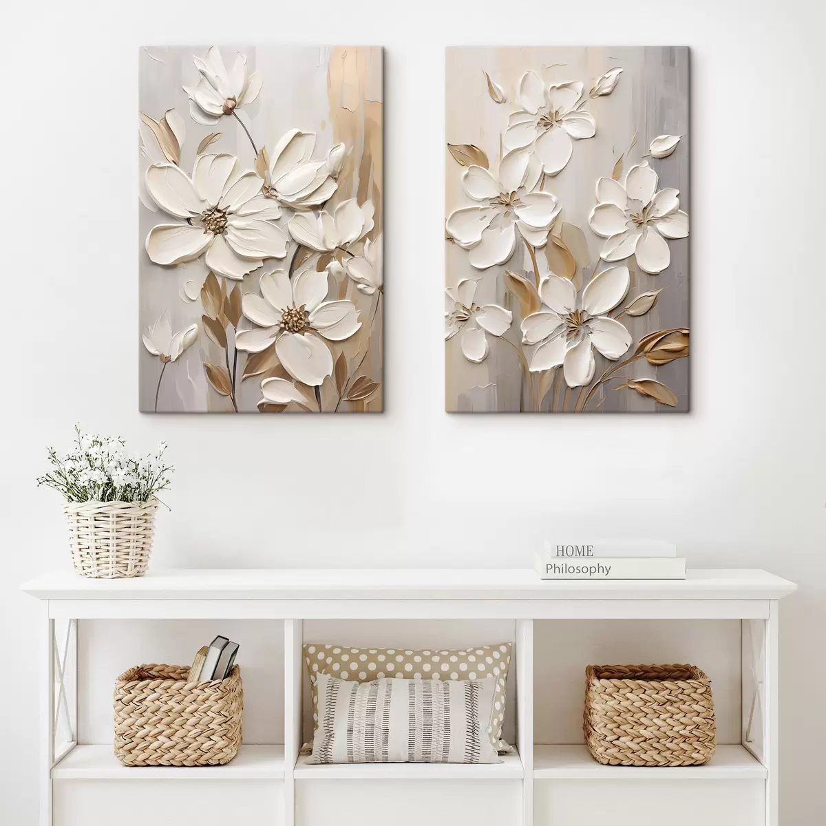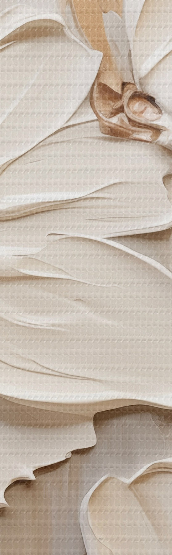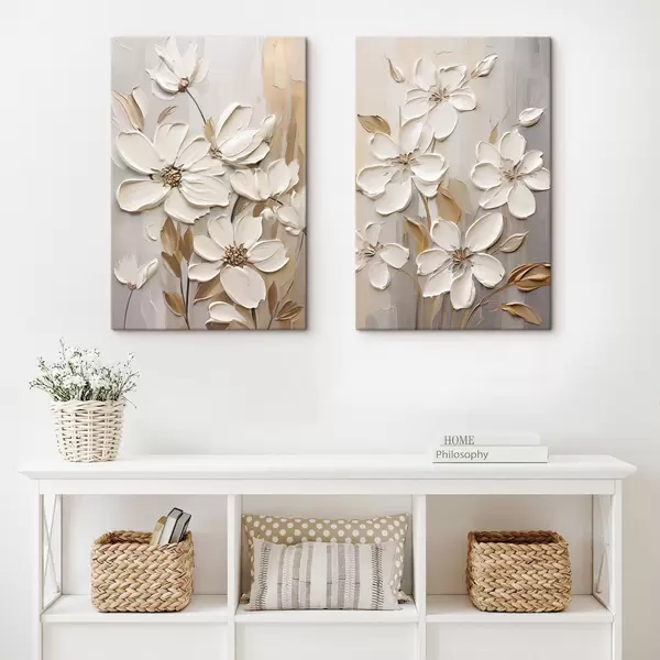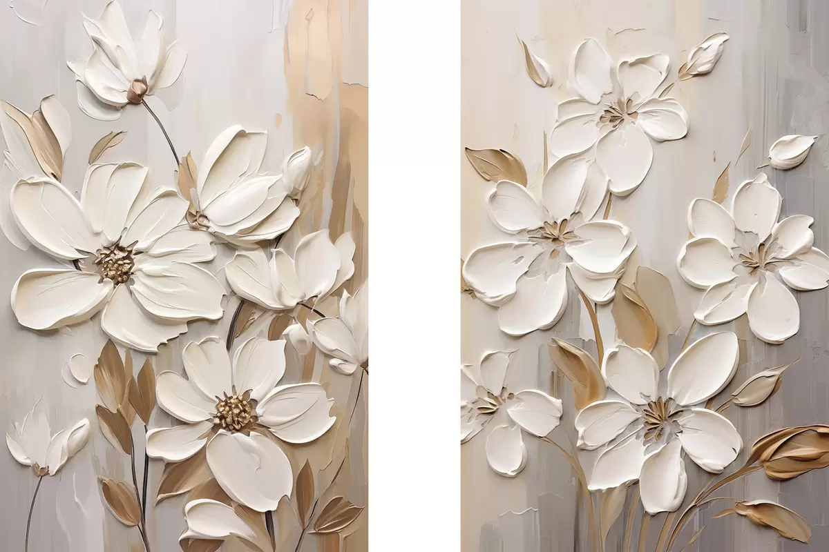 Quadri Fiori bianchi astratti con petali testurizzati, su uno sfondo neutro con sottili pennellate imitazione Nr m30057