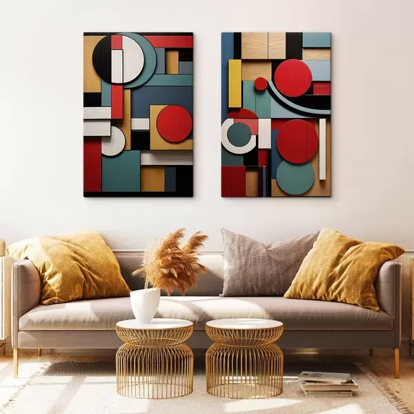 Quadri Composizione geometrica astratta con imitazione della texture del legno, rettangoli e cerchi rossi, neri, bianchi e verde acqua Nr m30058