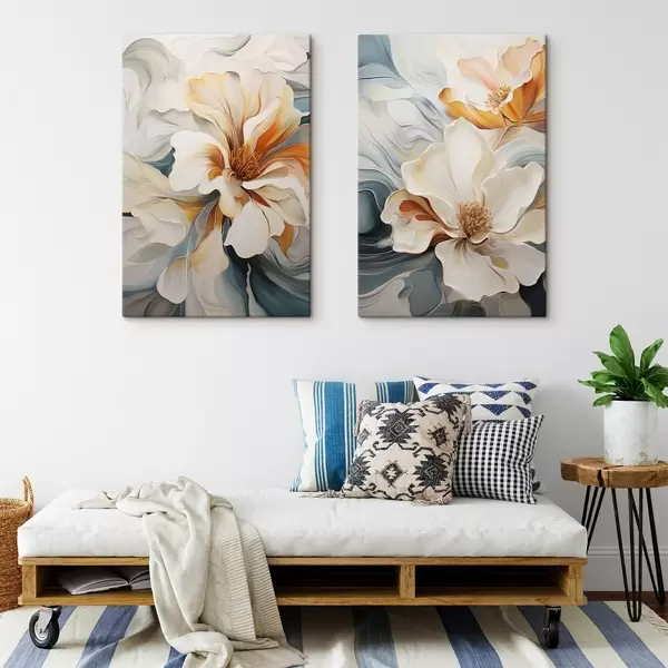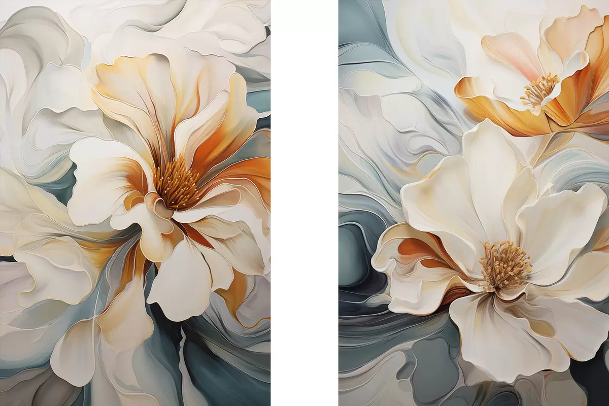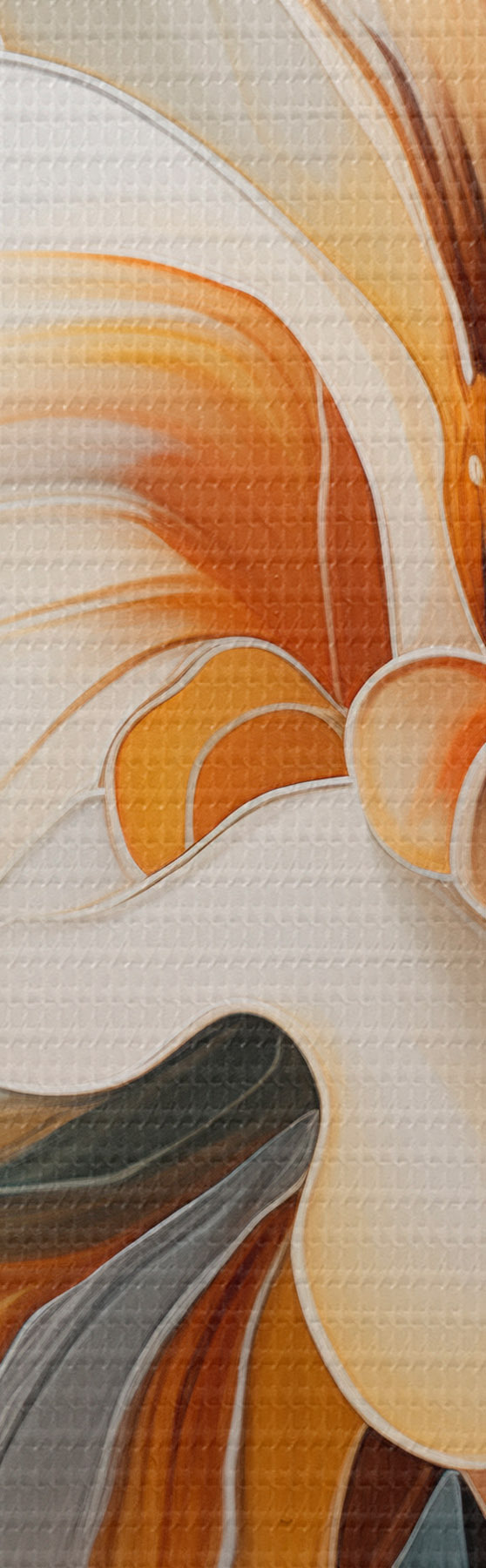 Quadri Fiore astratto di grandi dimensioni con petali bianchi, arancioni e verde acqua, sfondo strutturato Nr m30059