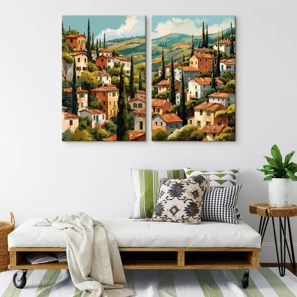 Quadri villaggio mediterraneo collinare, case dai toni caldi con tetti in terracotta Nr m30097