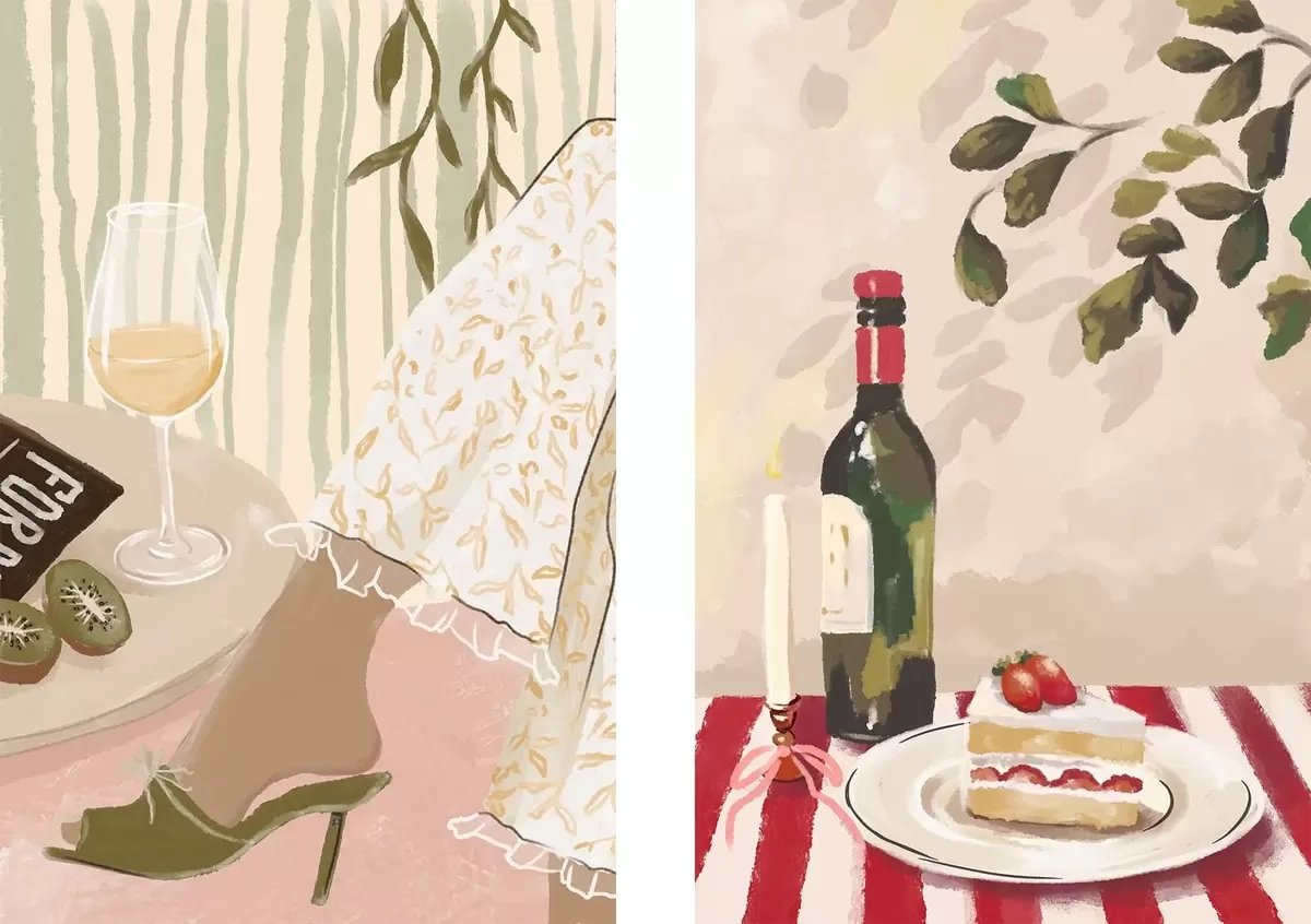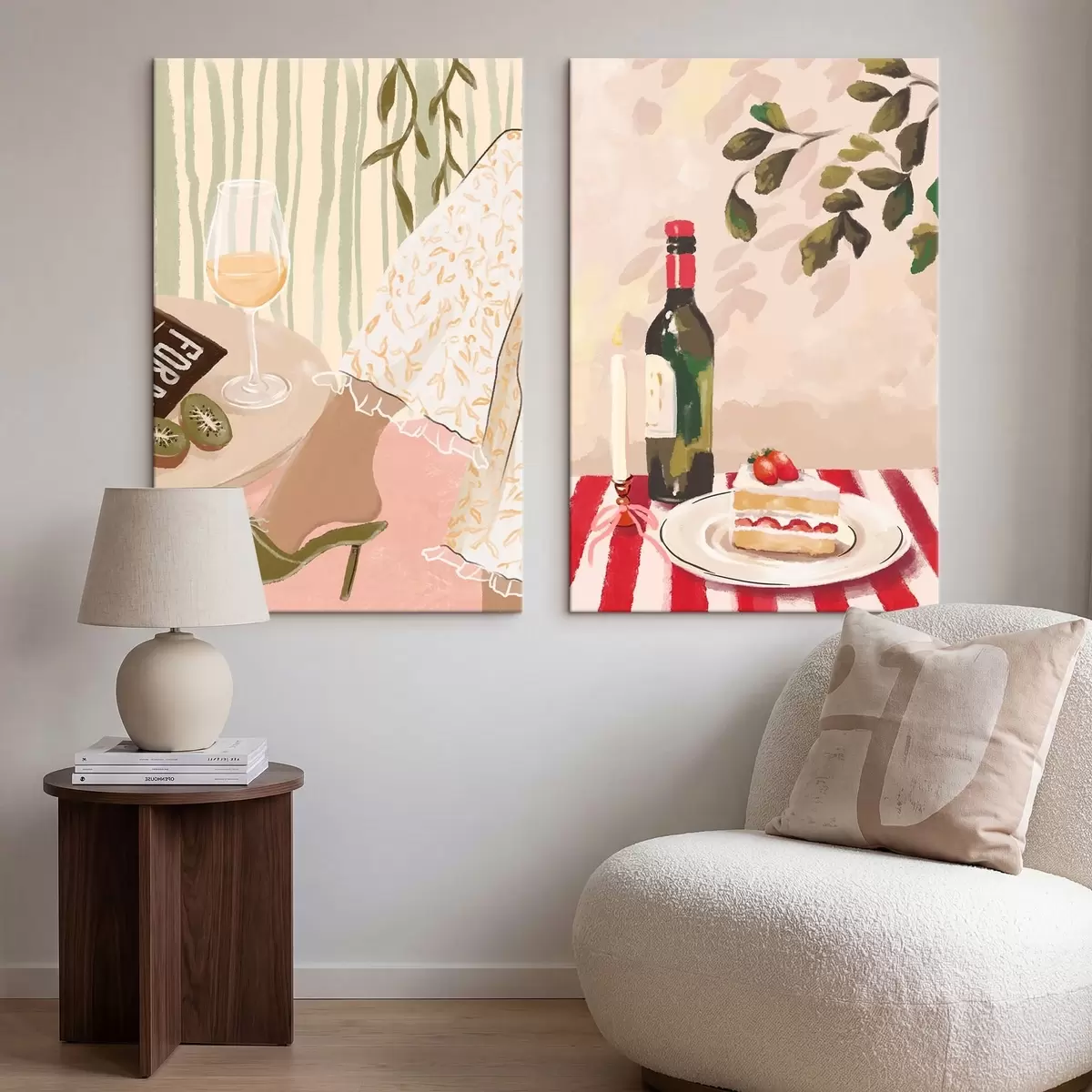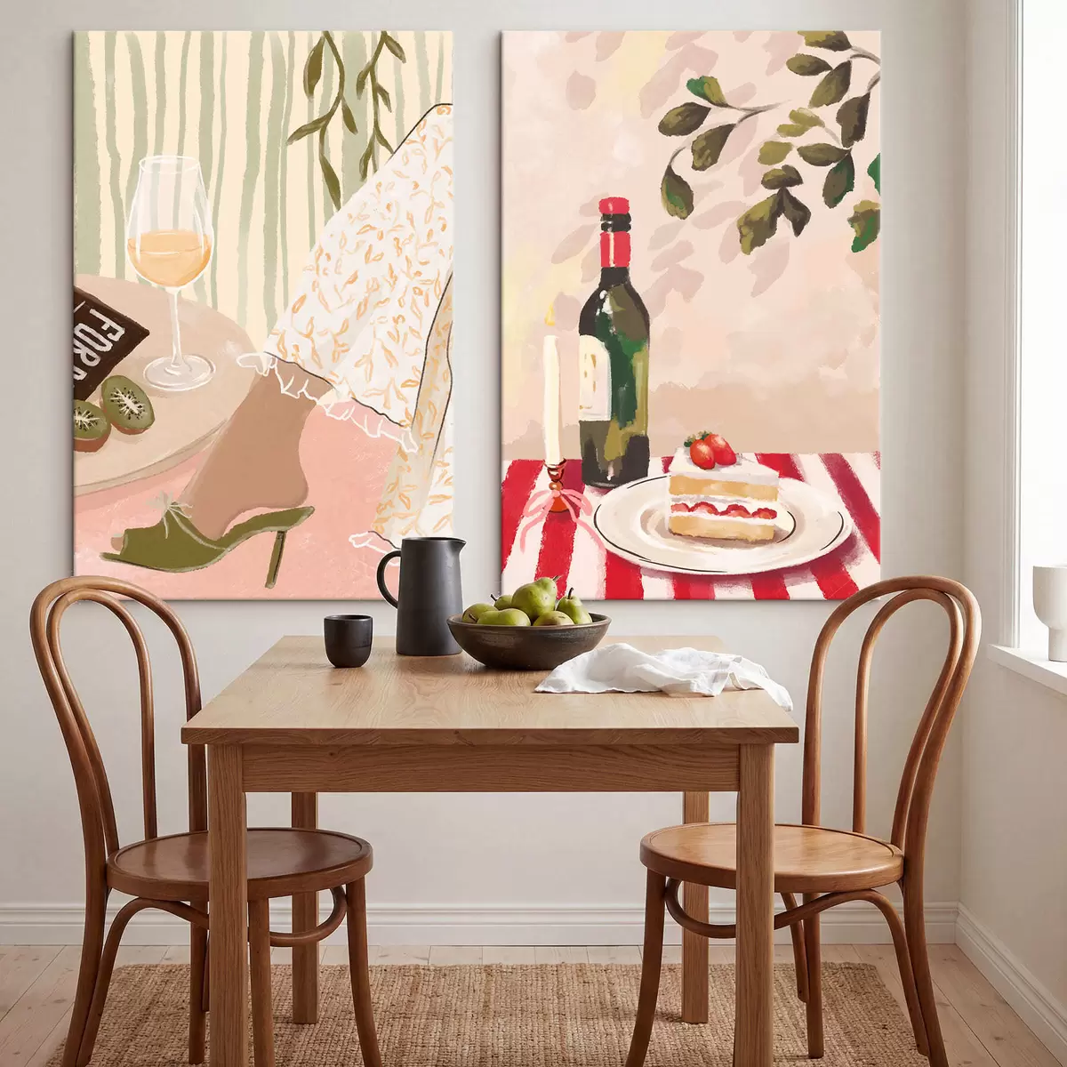 Quadri Bicchiere di vino, bottiglia e torta sul tavolo Nr m30105
