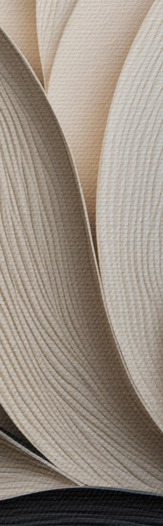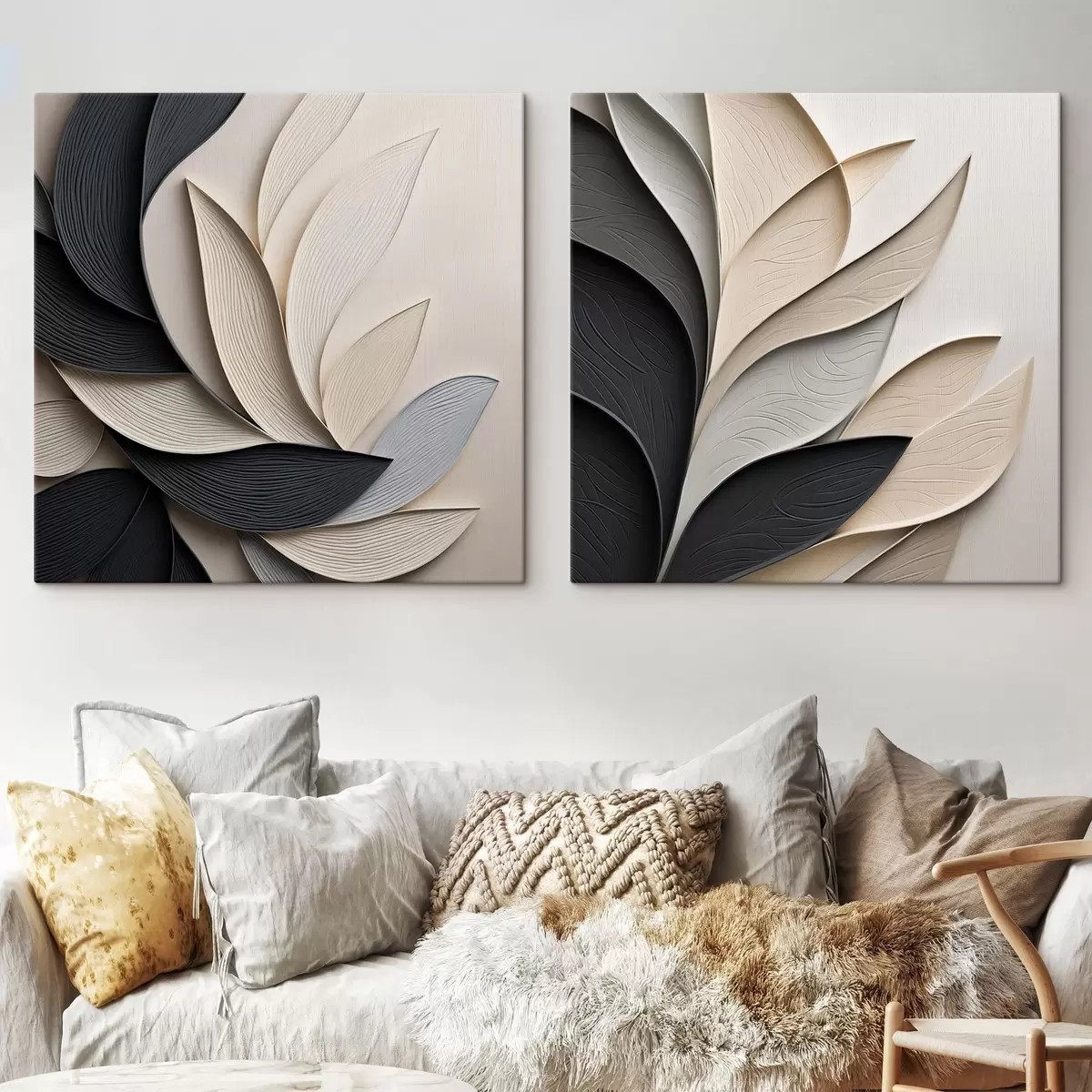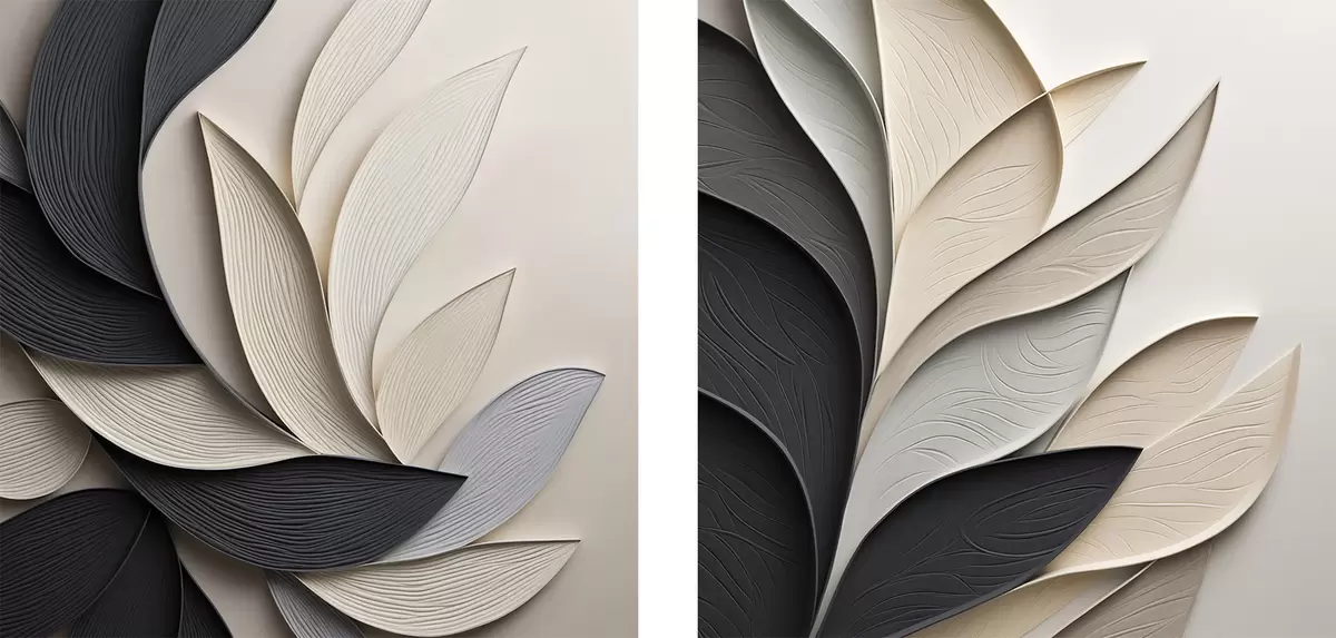 Quadri Composizione astratta di foglie sovrapposte, forme sinuose in nero, bianco e beige, opera d'arte materica Nr m30195