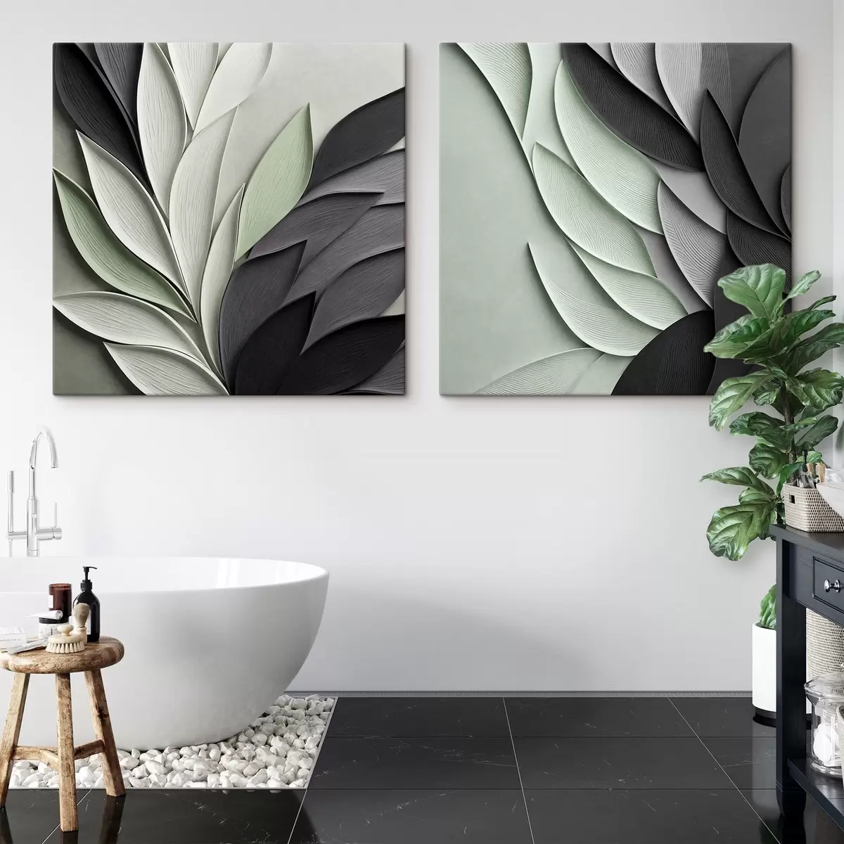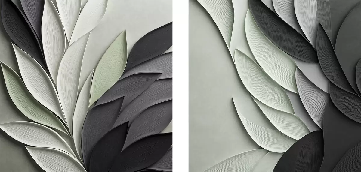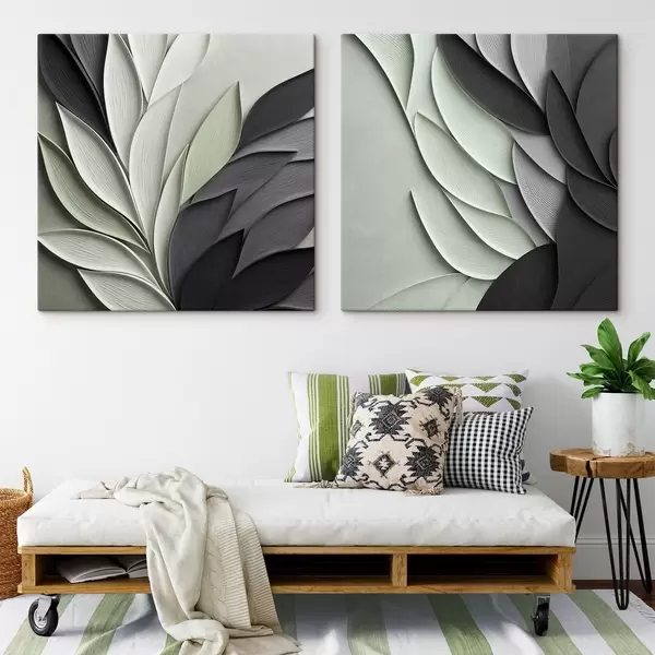 Quadri Foglie stilizzate in tonalità di grigio, bianco e verde tenue Nr m30210