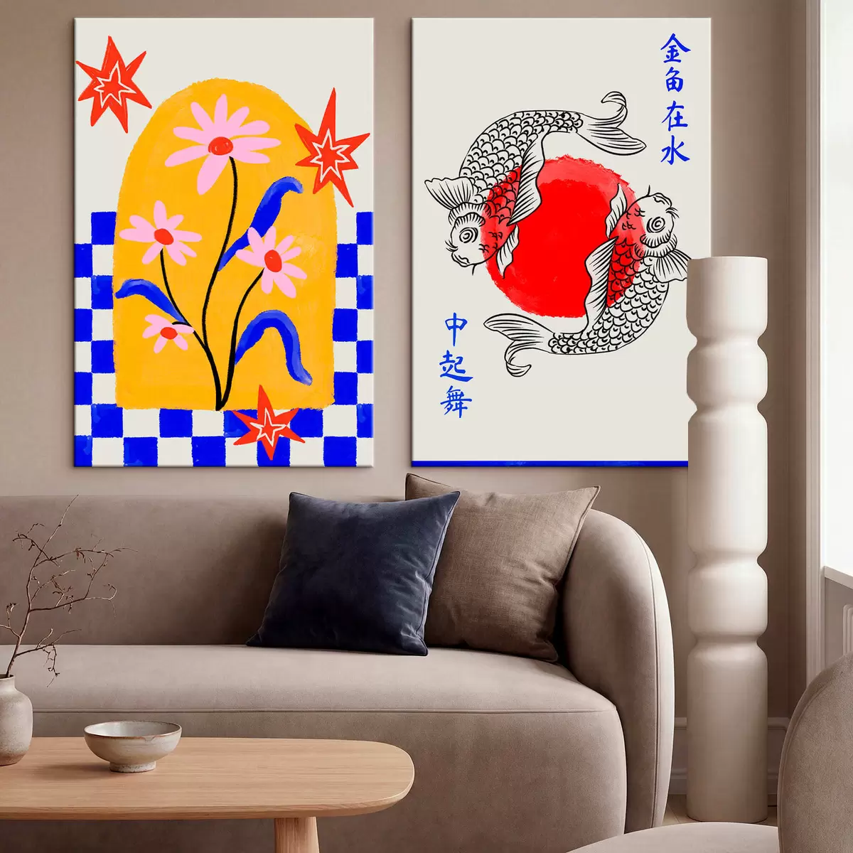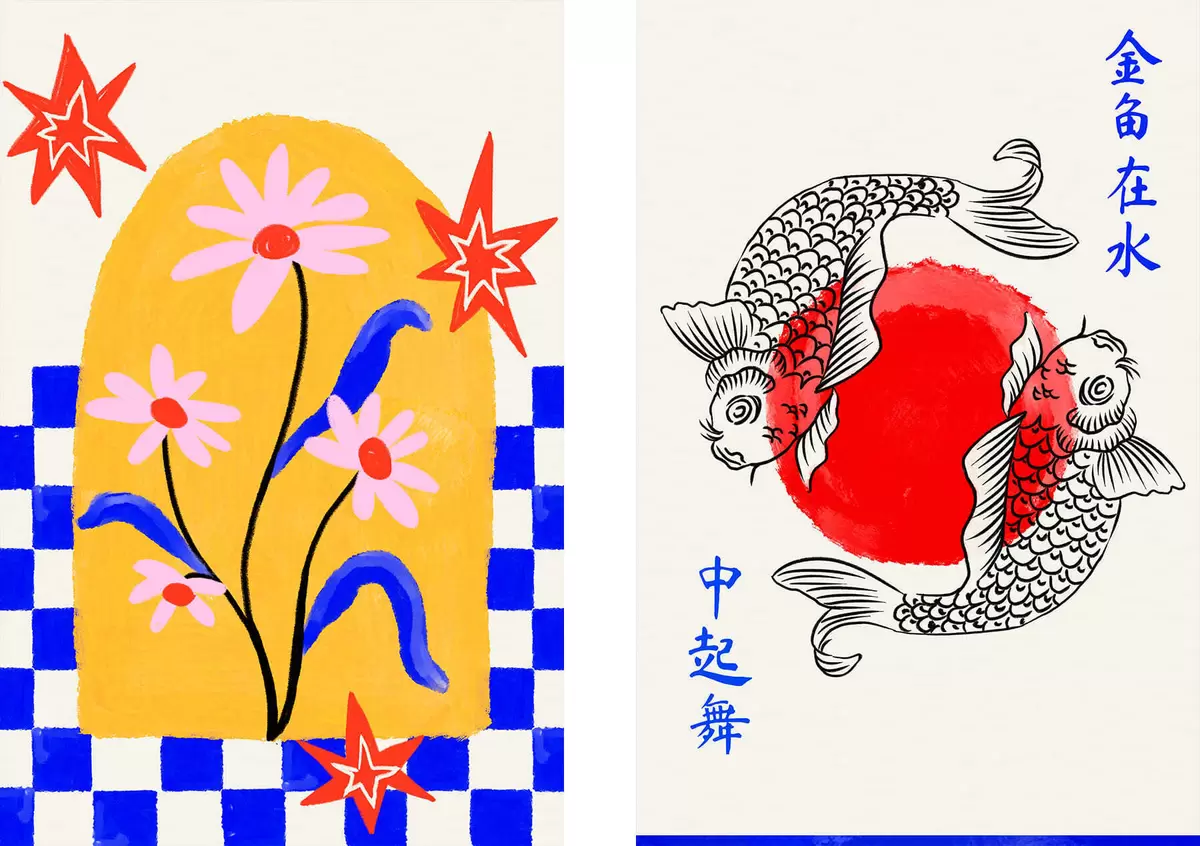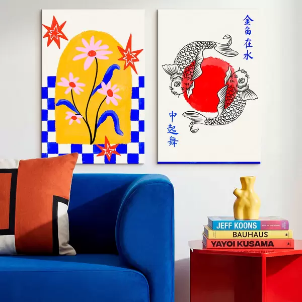 carta da parati Dittico con gatto e due pesci nei toni del rosso e del bianco nr. m30235