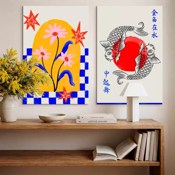 Quadri Dittico con gatto e due pesci nei toni del rosso e del bianco Nr m30235