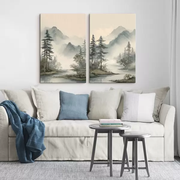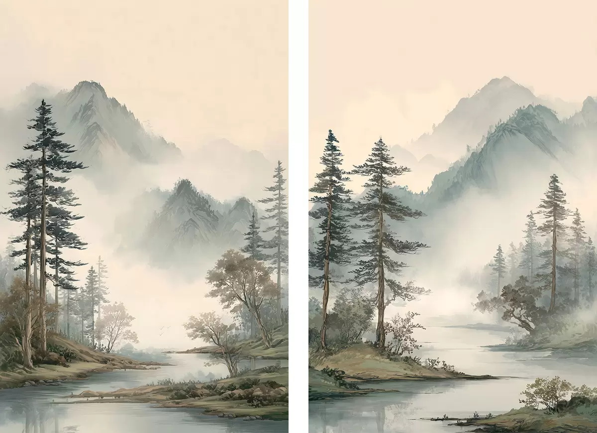 Quadri un paesaggio montano con pini e un fiume Nr m30262