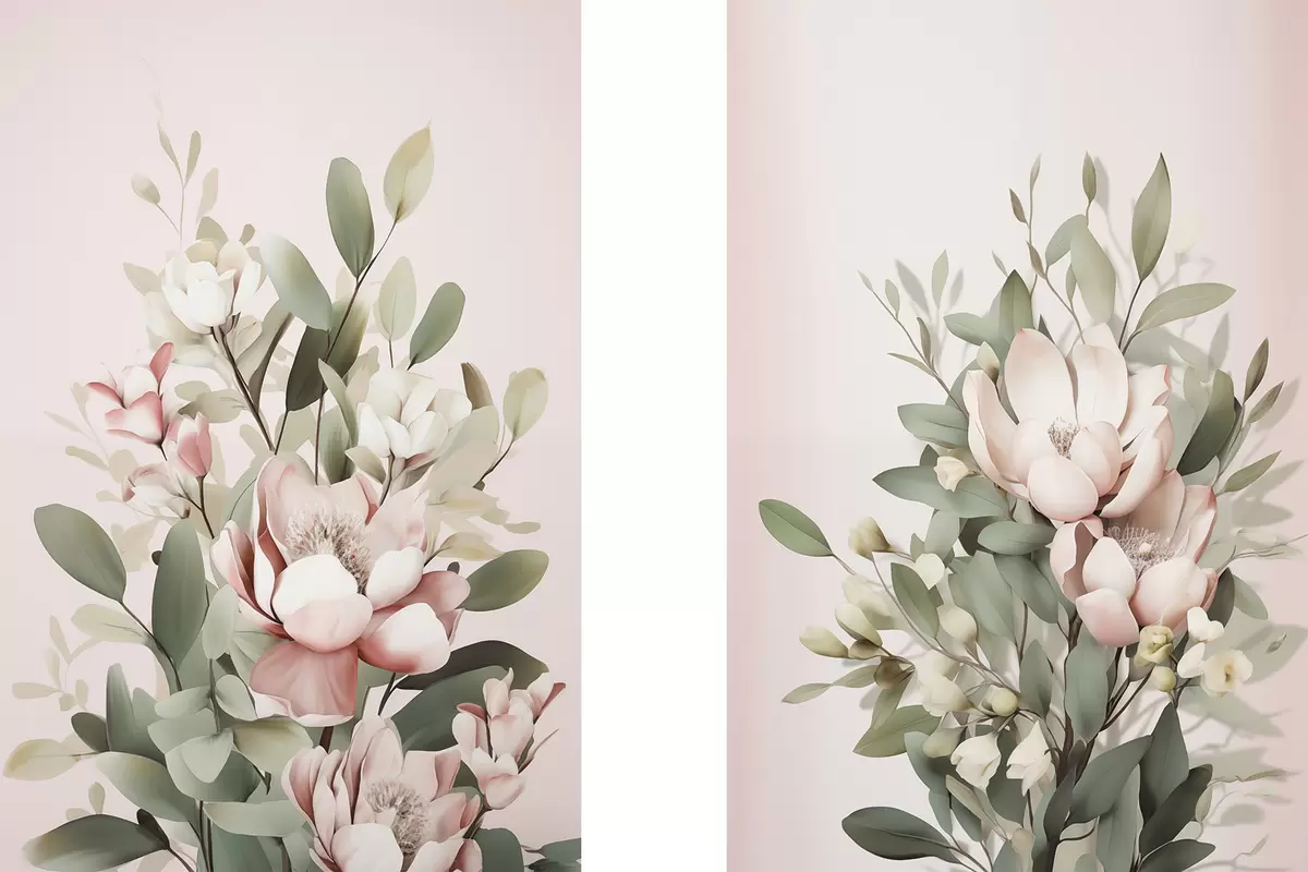 carta da parati Un bouquet di fiori dai colori pastello con foglie di eucalipto, su uno sfondo rosa pallido nr. m30314