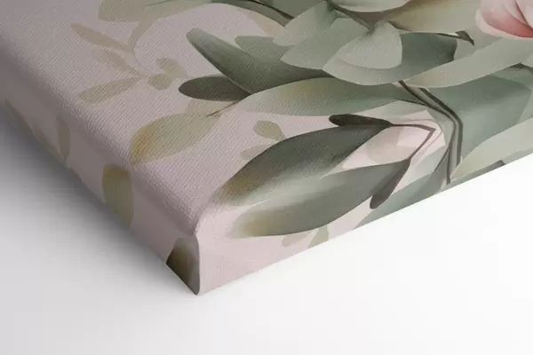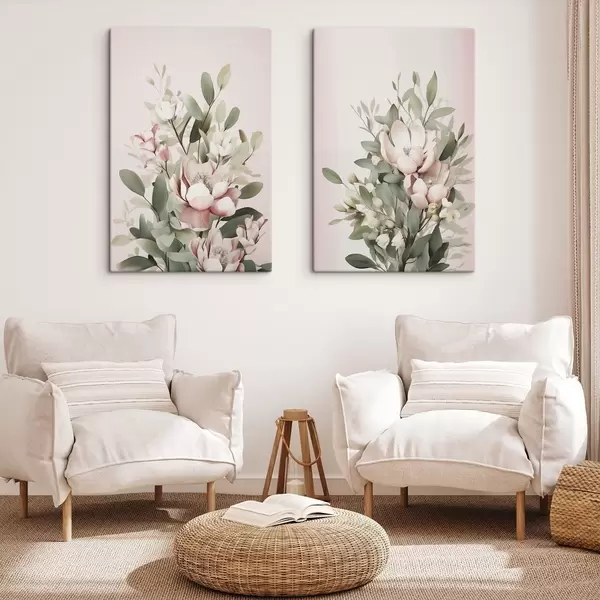 Quadri Un bouquet di fiori dai colori pastello con foglie di eucalipto, su uno sfondo rosa pallido Nr m30314