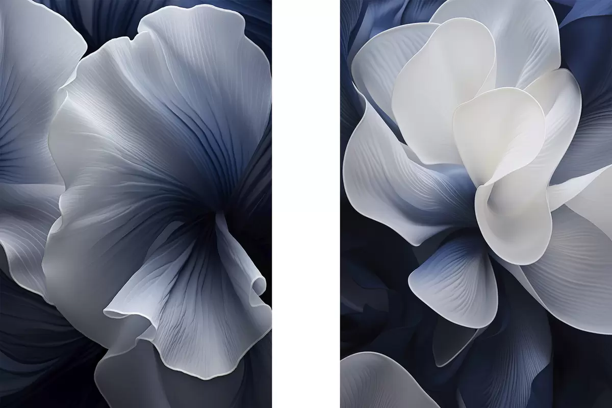 carta da parati Petali di fiori astratti blu e bianchi su sfondo scuro nr. m30316