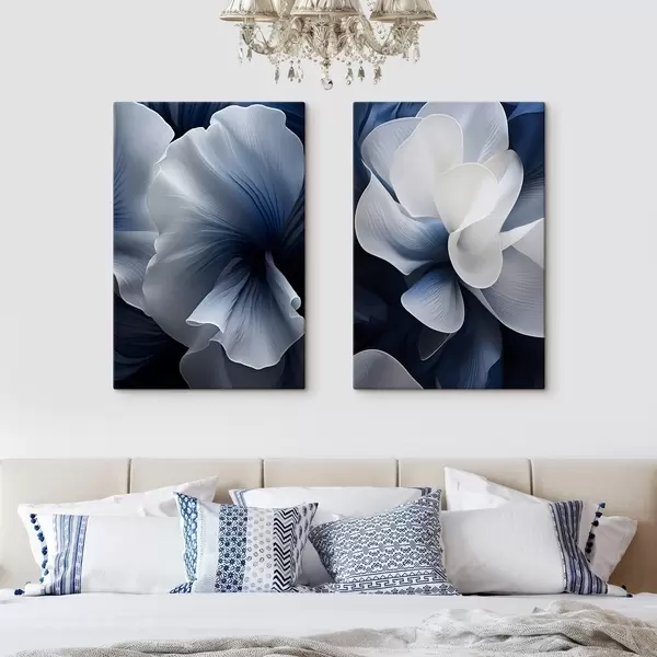 Quadri Petali di fiori astratti blu e bianchi su sfondo scuro Nr m30316