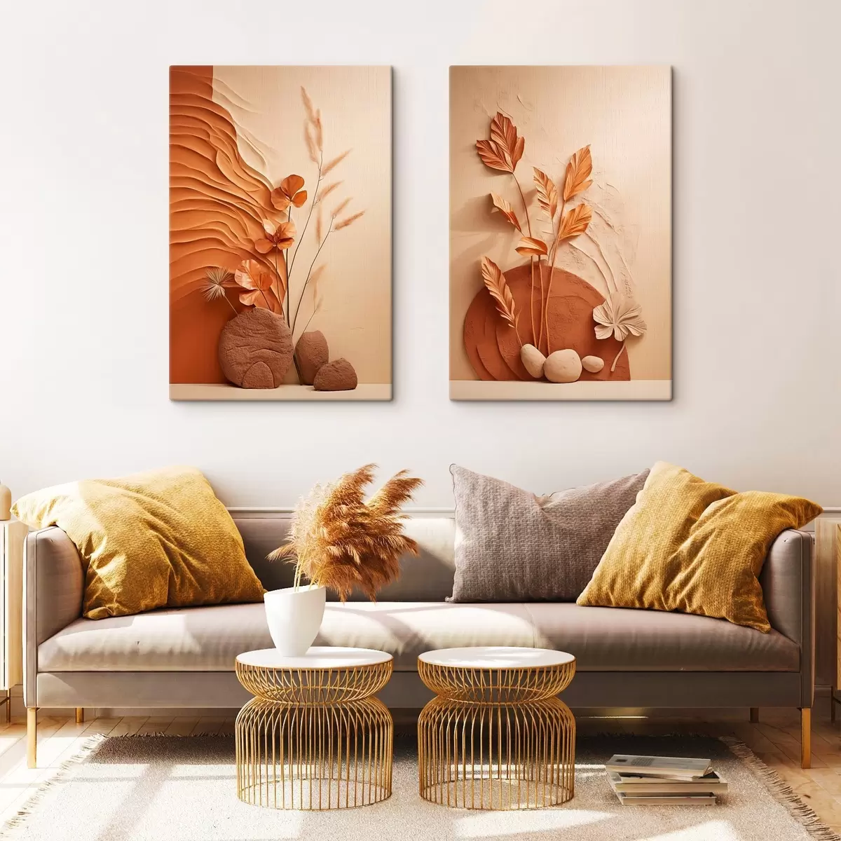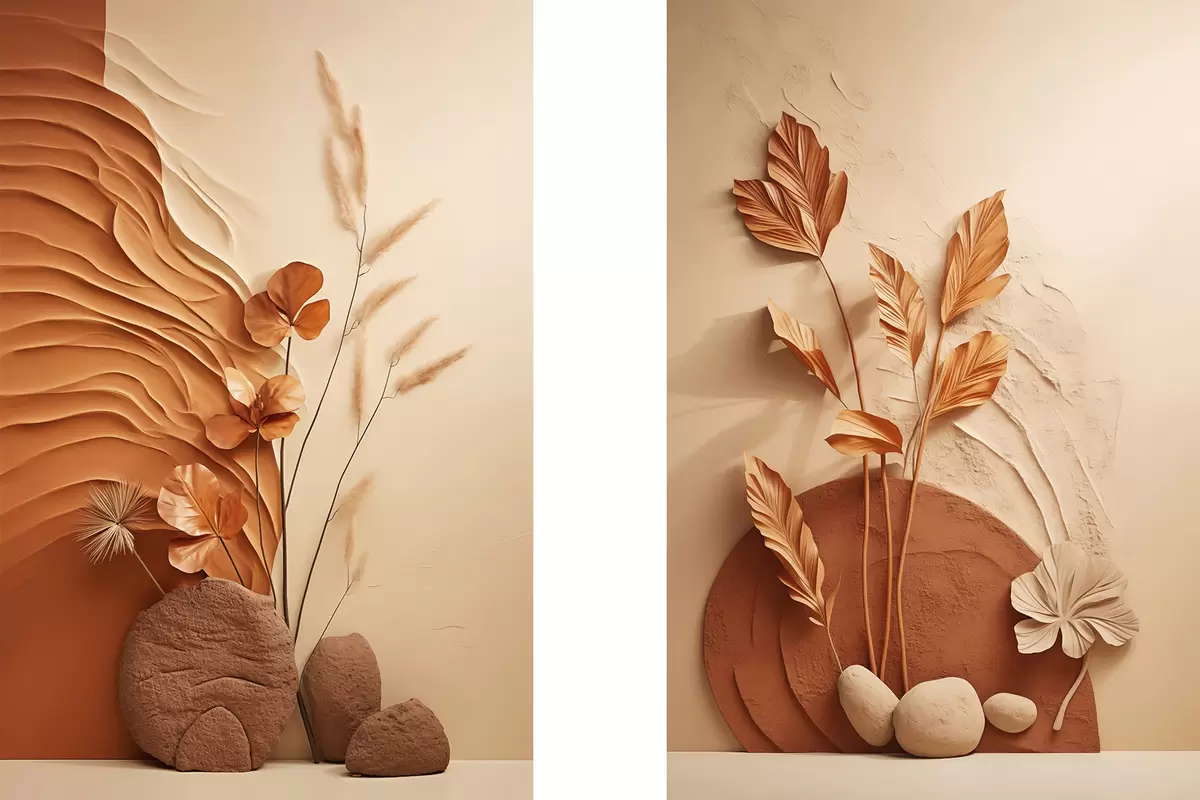 Quadri Un'opera d'arte minimalista con fiori secchi ed erba della pampa, su uno sfondo materico Nr m30320