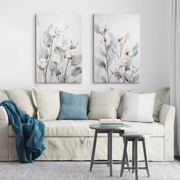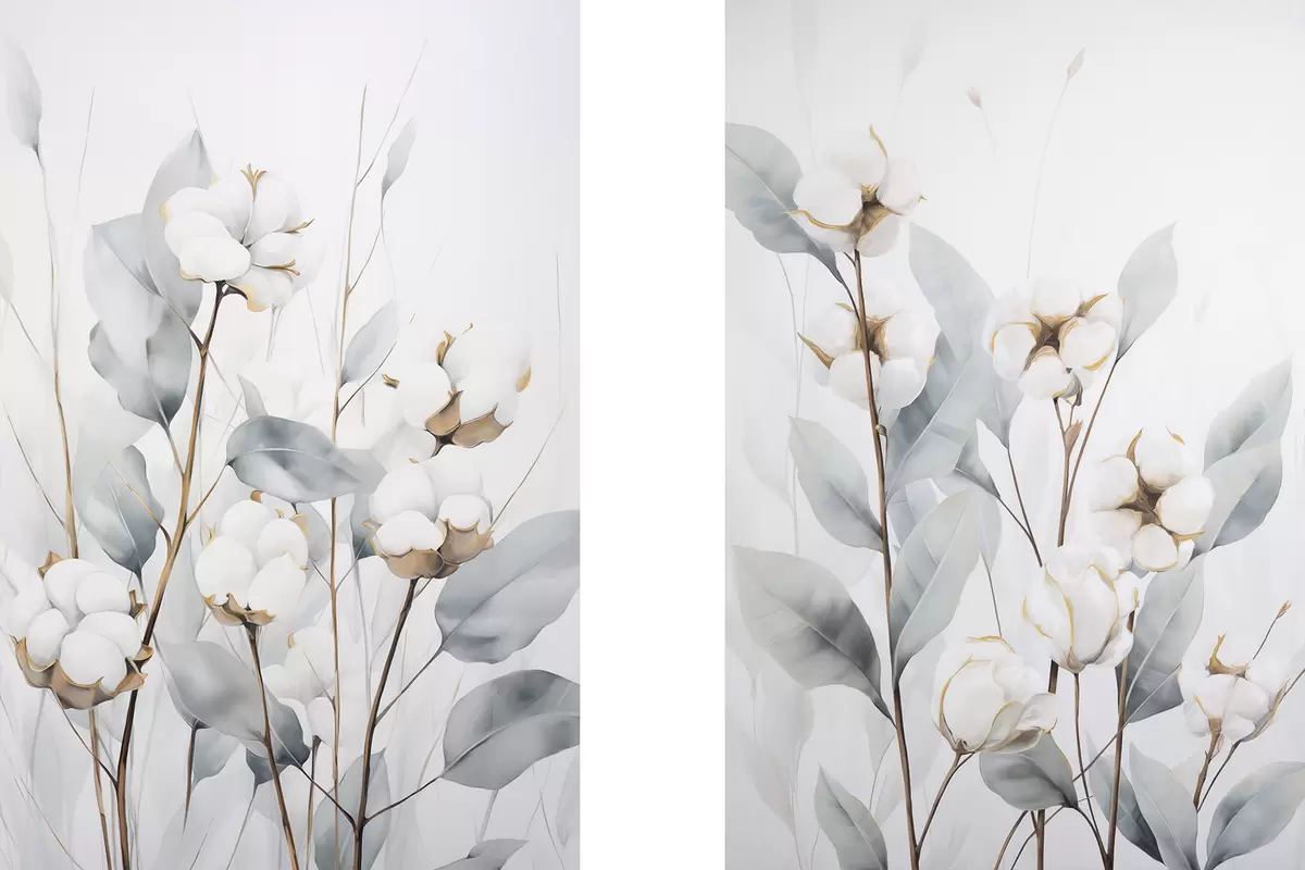 Quadri Pianta di cotone bianca con foglie di un tenue blu-verde su uno sfondo chiaro Nr m30322