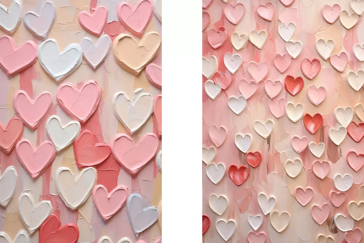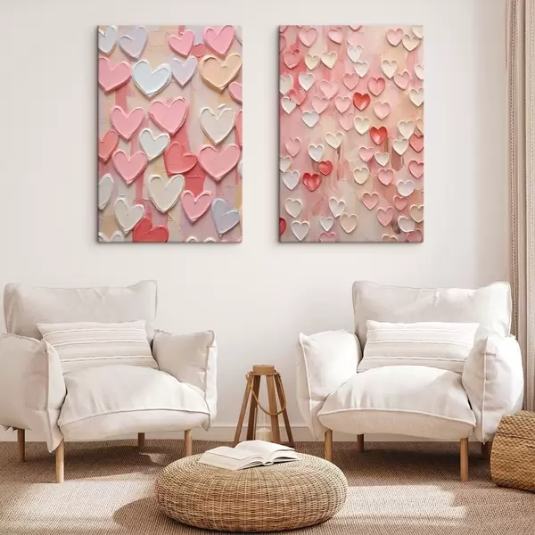 Quadri Cuori in varie tonalità di pesca e rosa, realizzati con una tecnica pittorica a texture Nr m30326