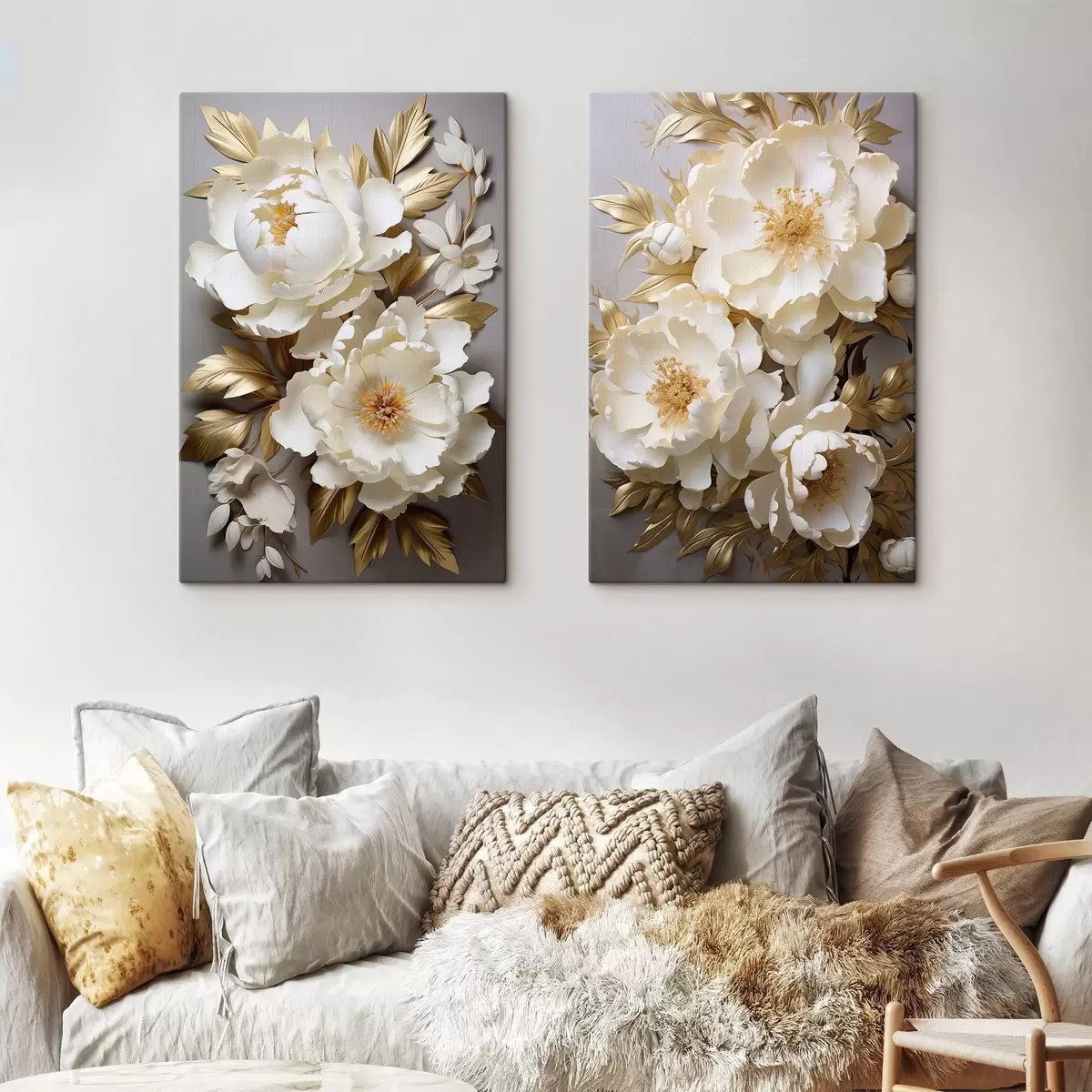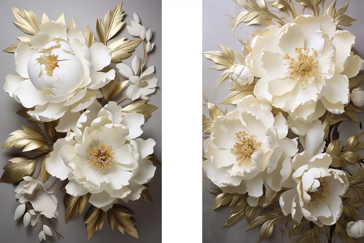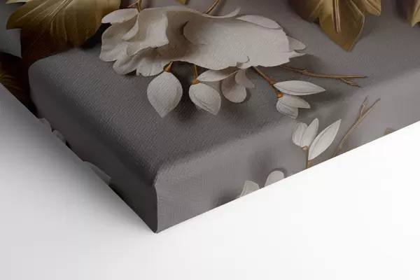 Quadri Grandi peonie bianche con foglie gialle su uno sfondo grigio Nr m30327