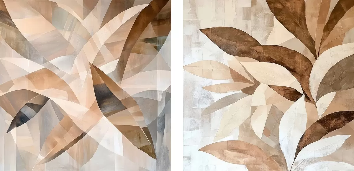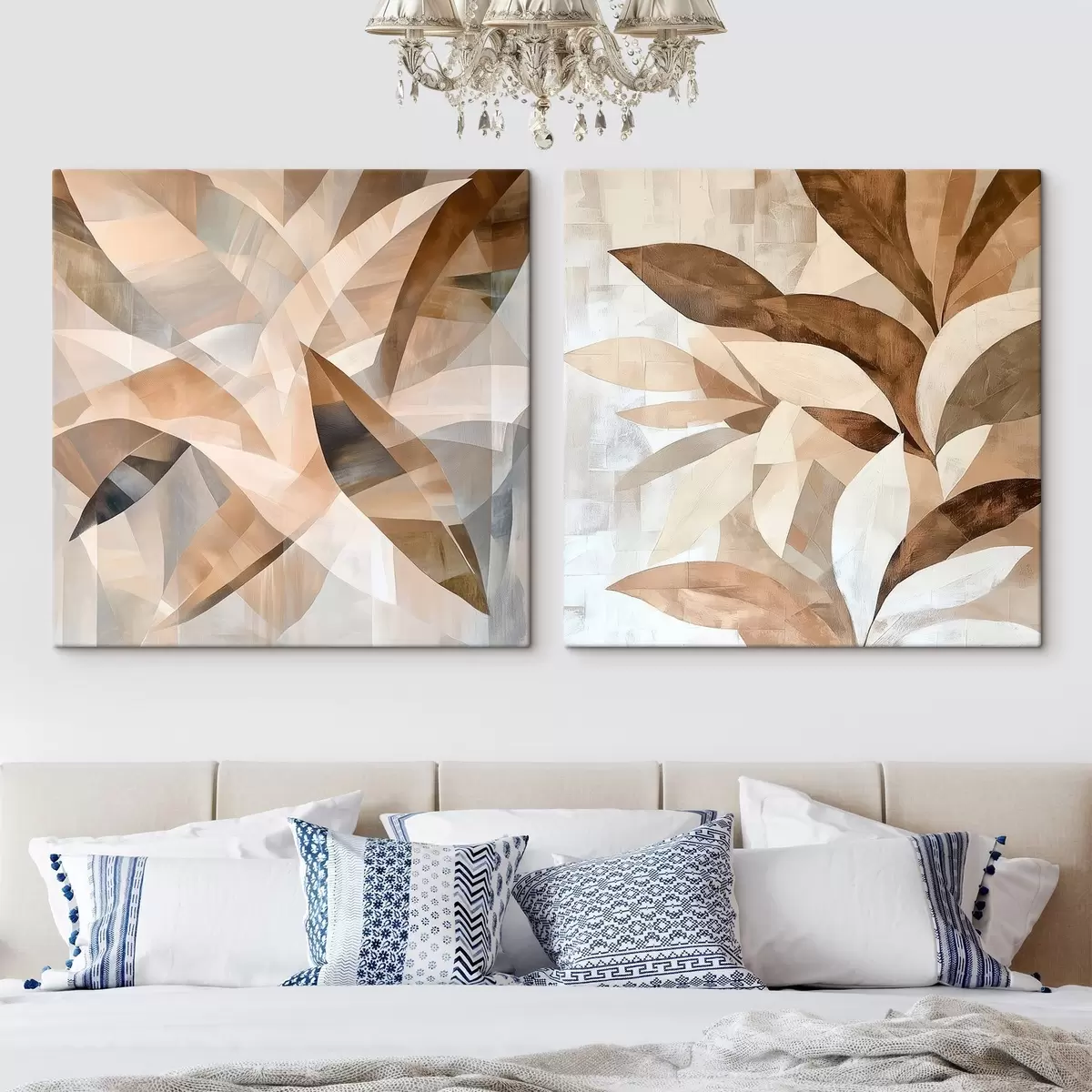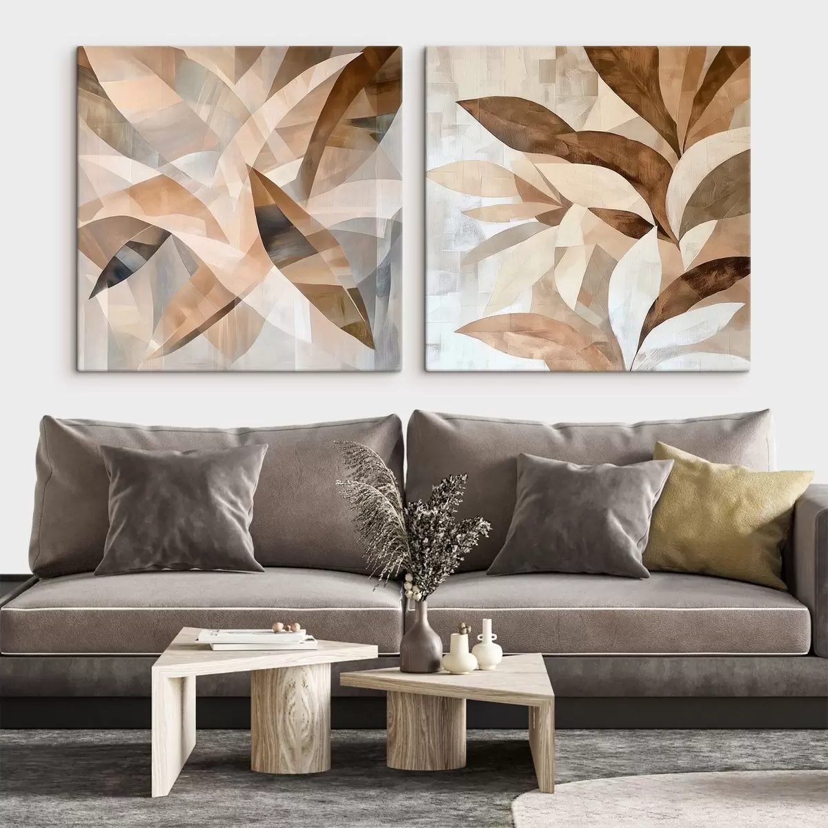 Quadri Fogliame stilizzata in calde tonalità sabbia, in uno stile illustrativo contemporaneo per interni Nr m30350