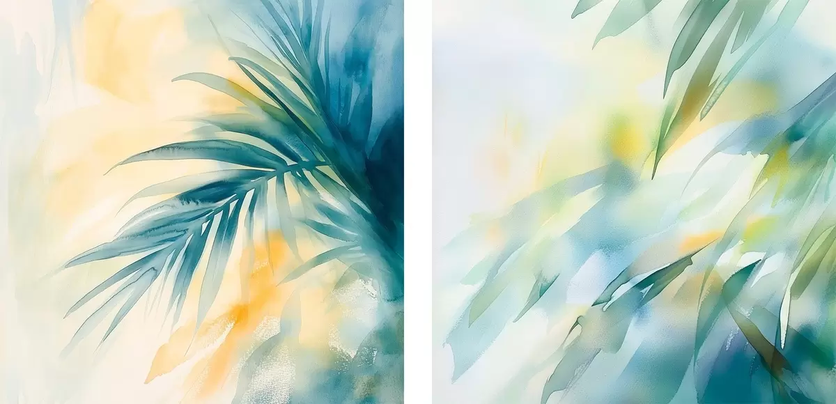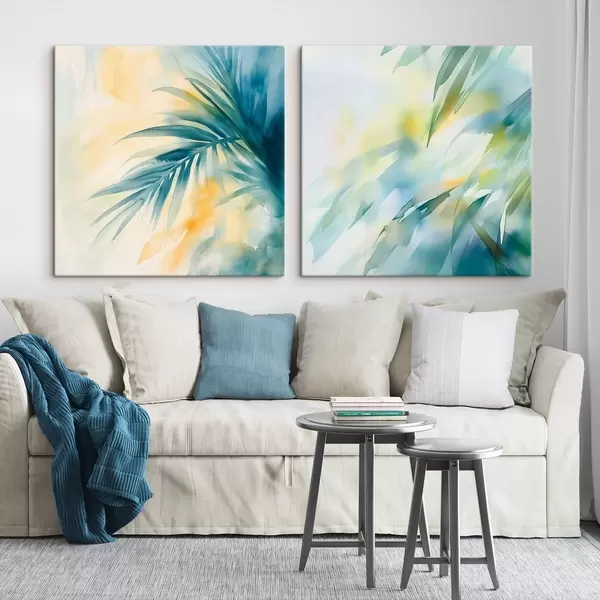 Quadri Foglie tropicali in una palette di colori turchese e giallo, in stile acquerello Nr m30351