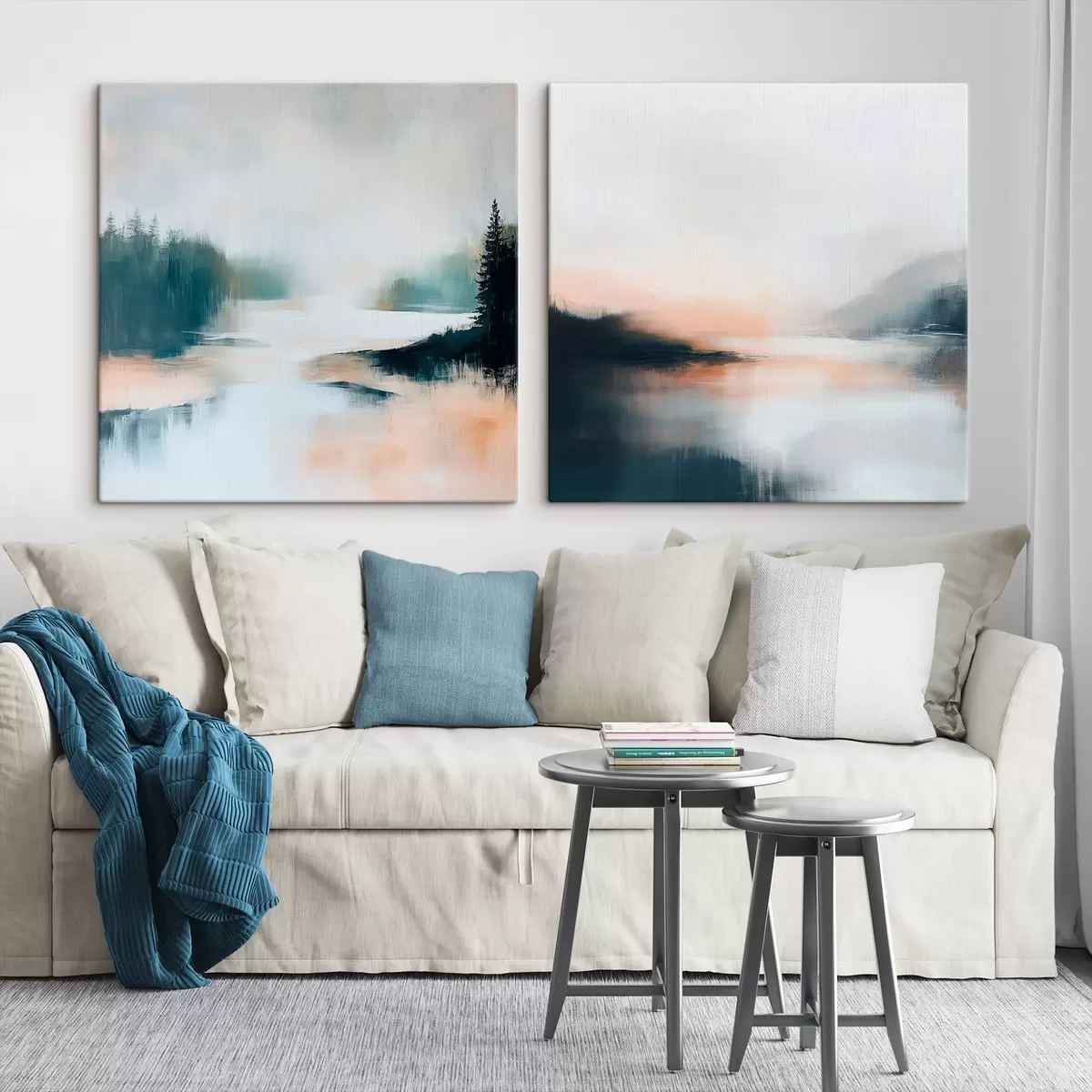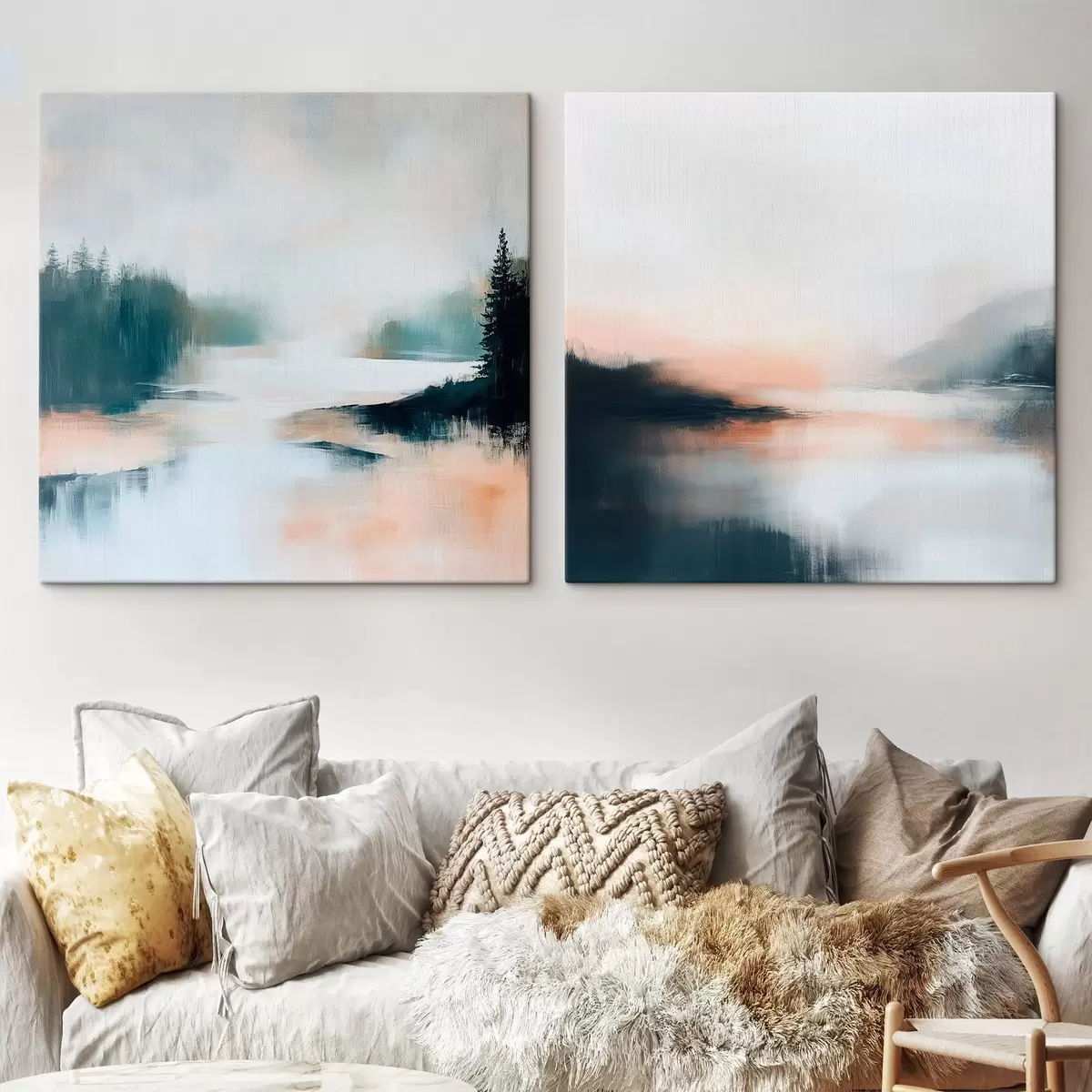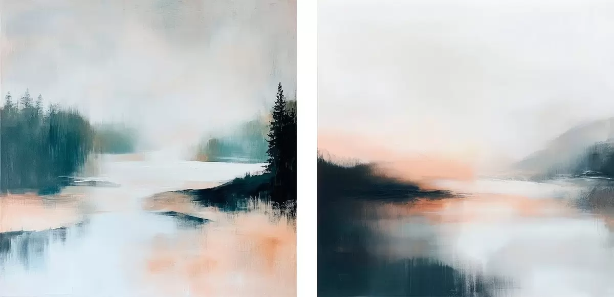 Quadri Paesaggio nebbioso con alberi di conifere e un lago, in stile pittorico contemporaneo Nr m30357