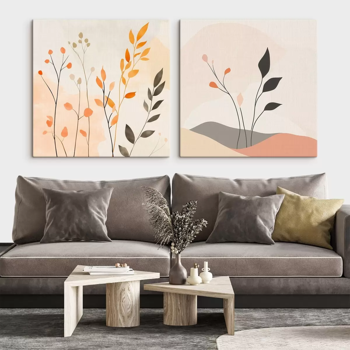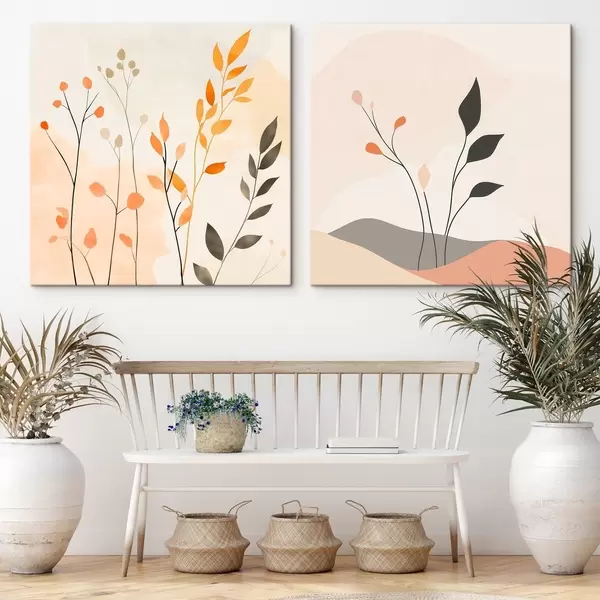 Quadri Dittico floreale dai caldi toni beige-corallo con linee grafiche in stile minimalista Nr m30363