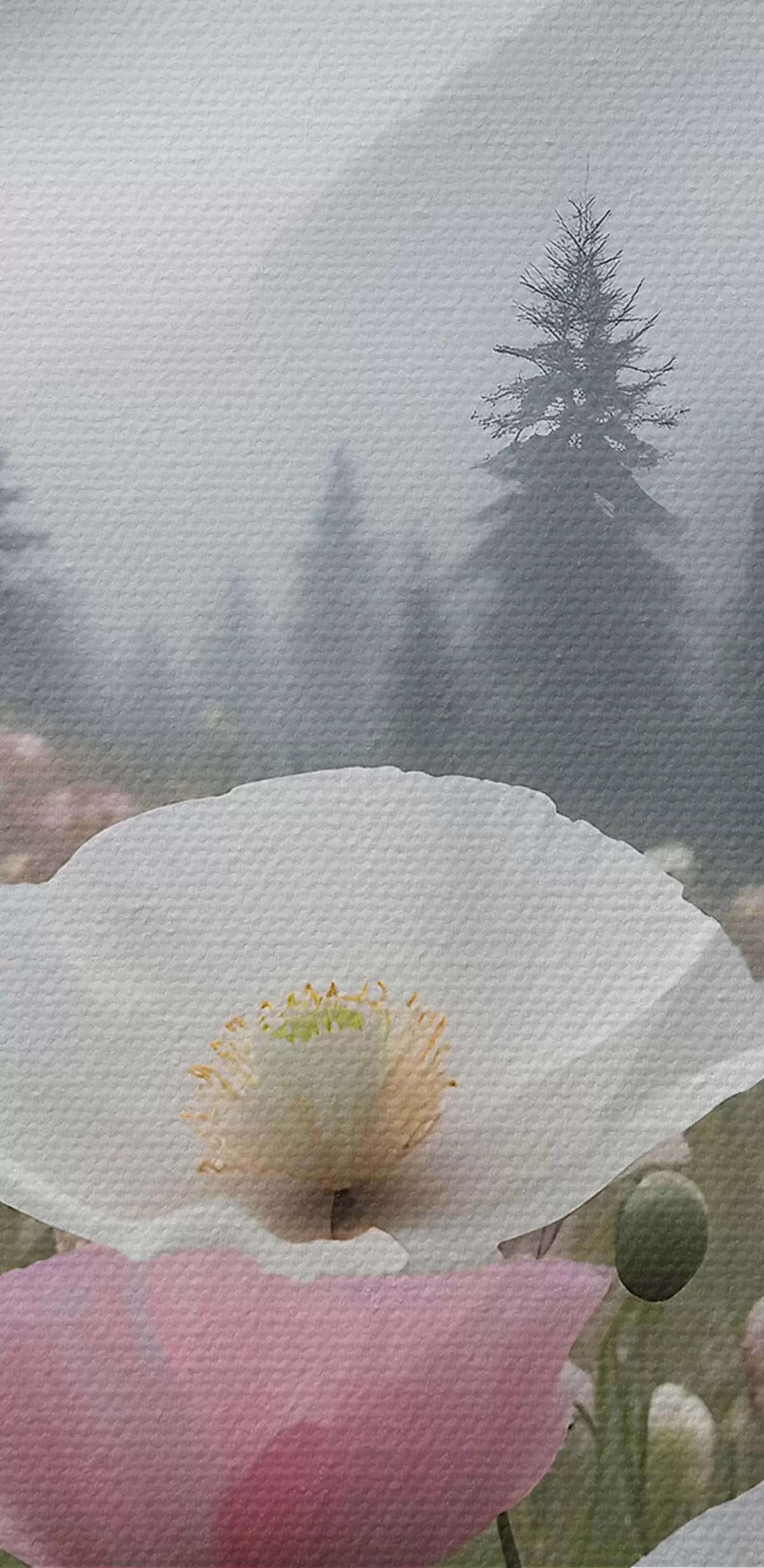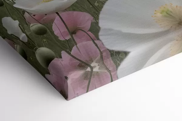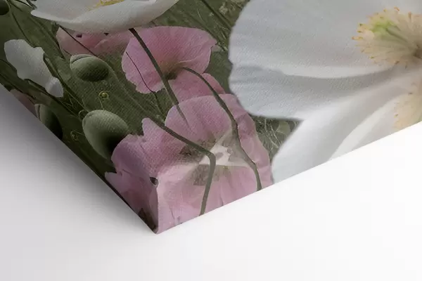 Quadri Un campo di papaveri rosa e bianchi nel paesaggio montano sullo sfondo Nr s38369