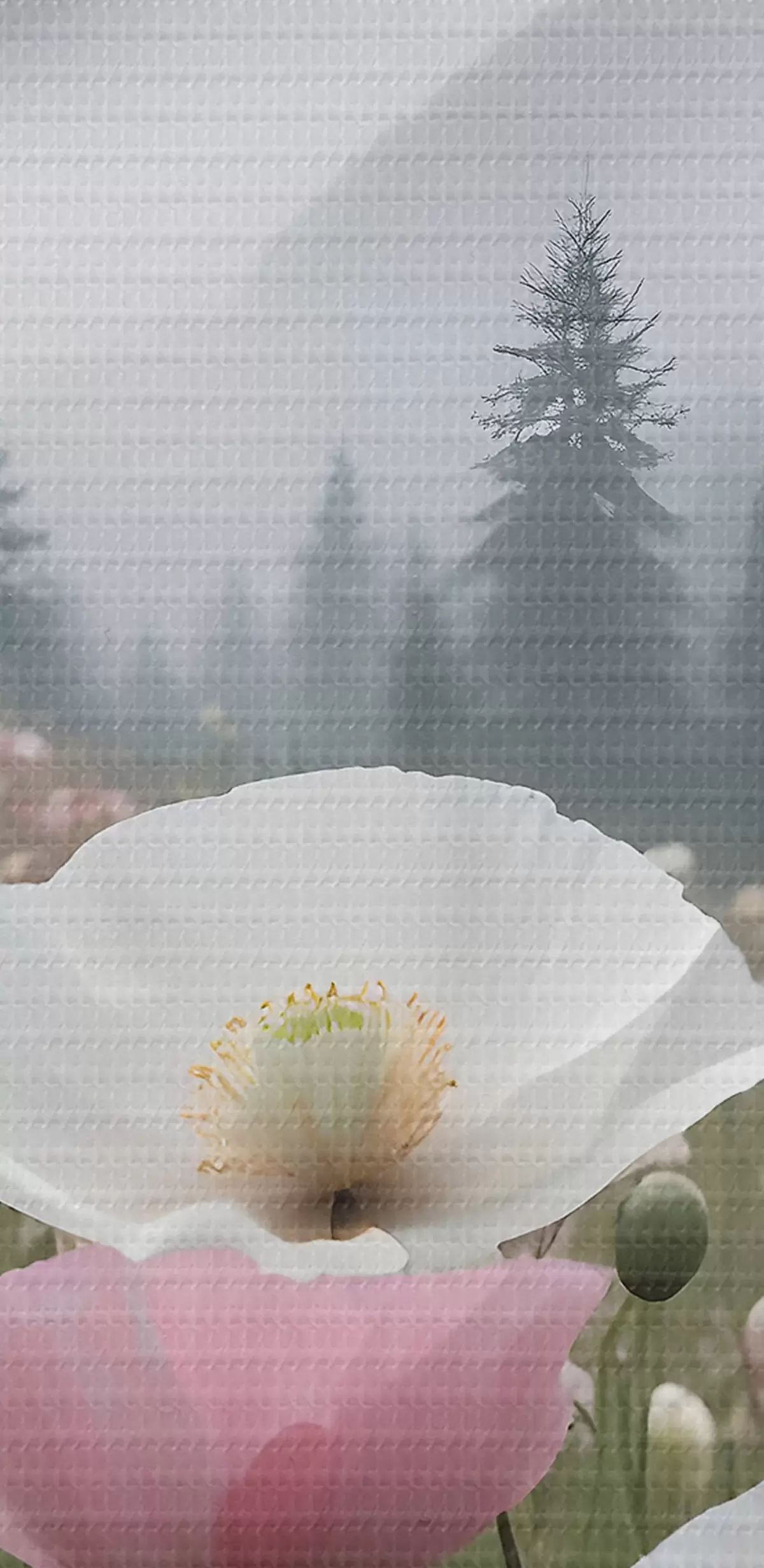 carta da parati Un campo di papaveri rosa e bianchi nel paesaggio montano sullo sfondo nr. s38369