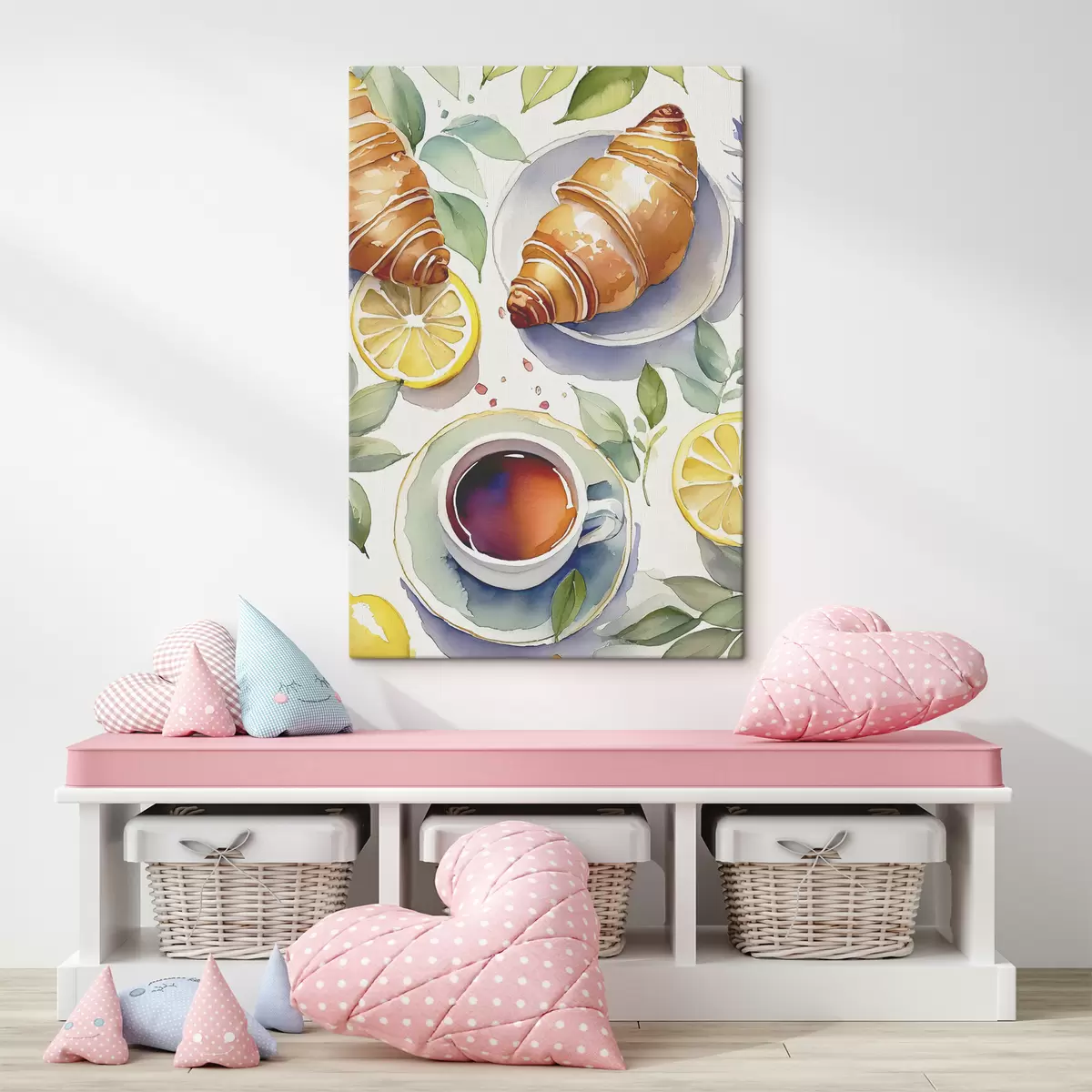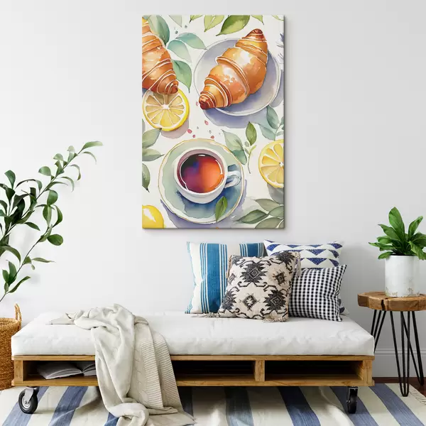 Quadri Croissant acquerello, tazza di tè, colazione, limoni, stile rustico Nr s38389