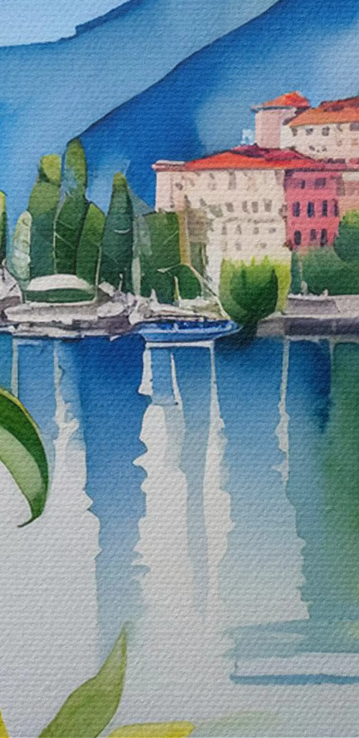 Quadri Lago di Como, acquerello, Italia, estate, montagne, limone, mare, città vecchia Nr s38398