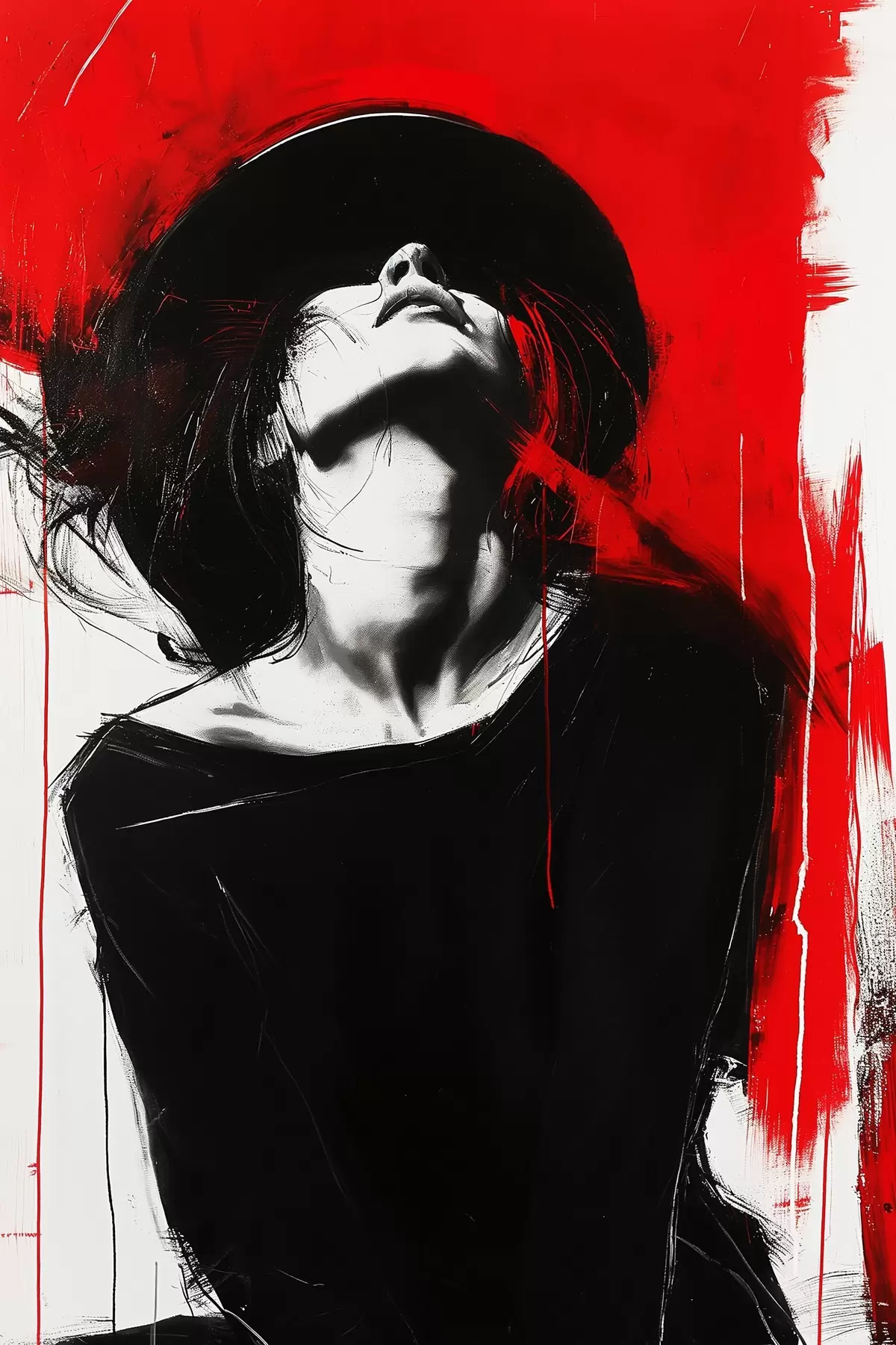 Quadri Una donna con cappello nero su sfondo rosso Nr s38561