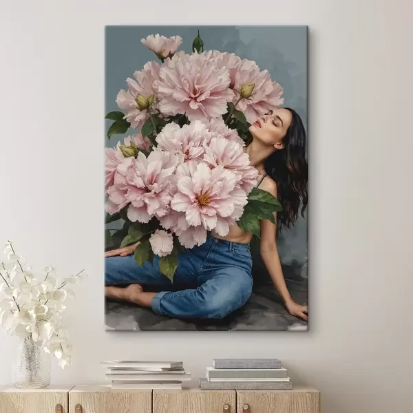 Quadri Una donna seduta a terra con un grande mazzo di fiori Nr s38595