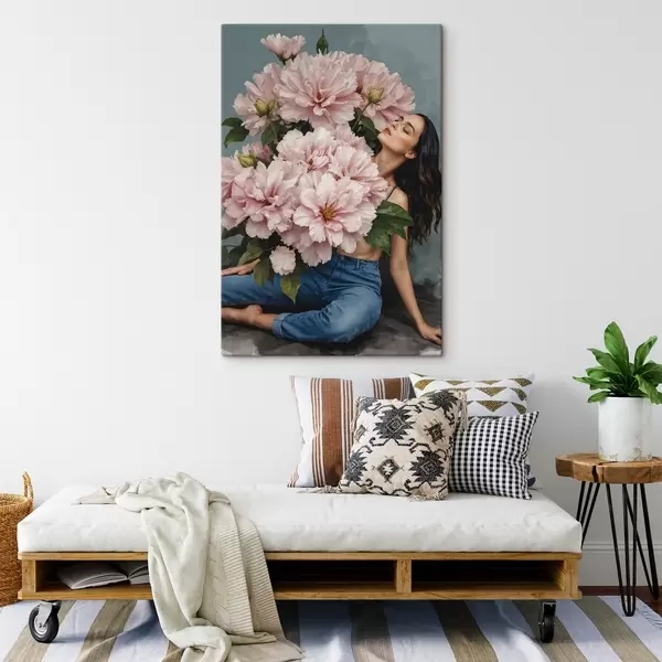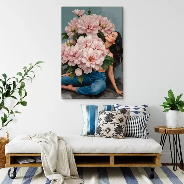 Quadri Una donna seduta a terra con un grande mazzo di fiori Nr s38595