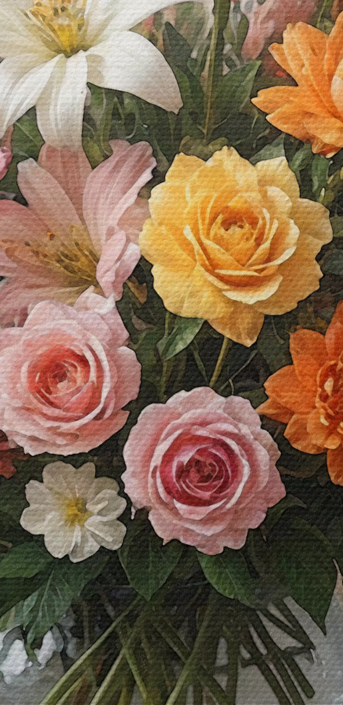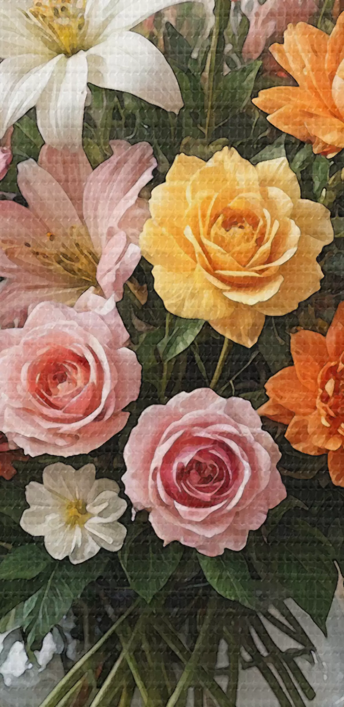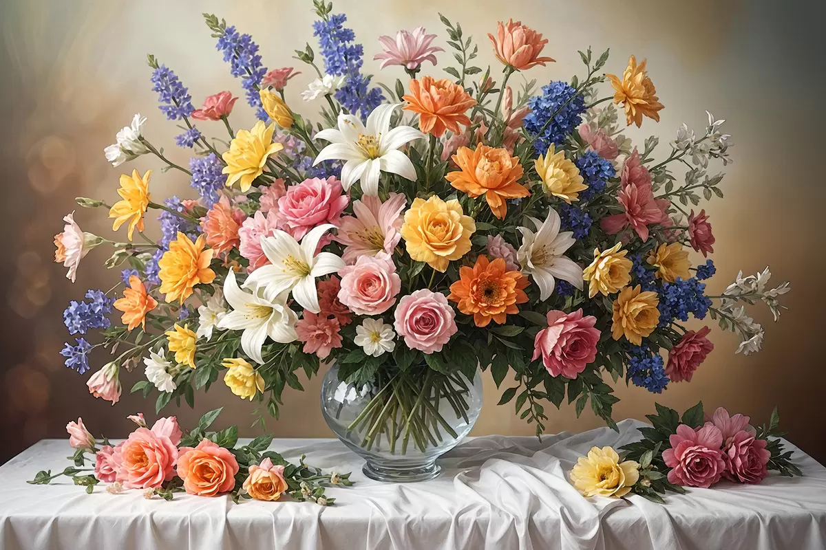 carta da parati Un vivace bouquet di vari fiori colorati in un vaso di vetro su una tovaglia bianca dipinta d'arte vintage nr. s38825