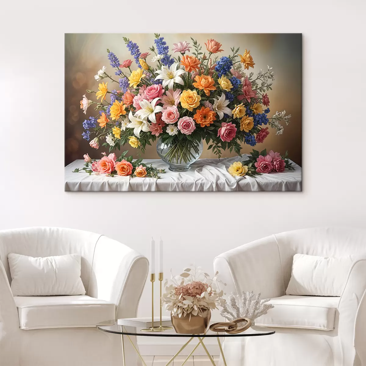 Quadri Un vivace bouquet di vari fiori colorati in un vaso di vetro su una tovaglia bianca dipinta d'arte vintage Nr s38825