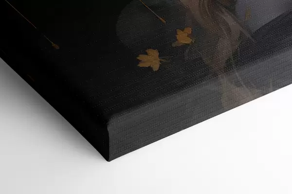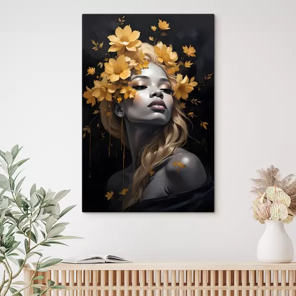 Quadri Un ritratto di giovane donna circondata da foglie autunnali giallo su uno sfondo scuro Nr s38834