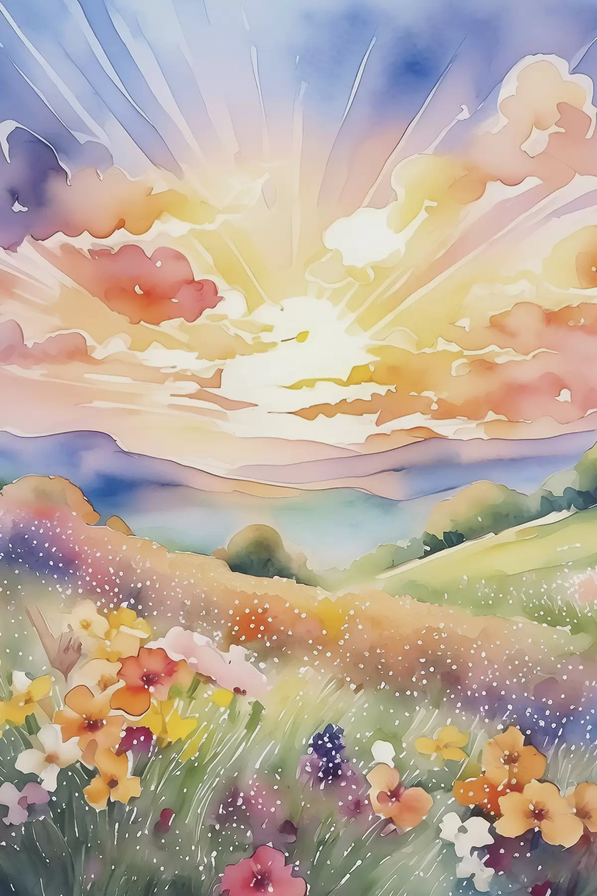 carta da parati Tramonto nel campo estivo, fiori, sole, cielo colorato, nuvole, natura nr. s38842